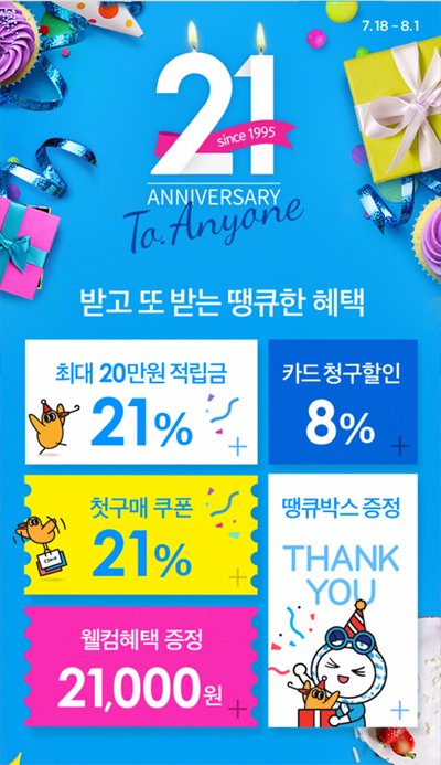 [아시아경제 조호윤 기자]CJ오쇼핑이 창립 21주년을 맞아 다음달 1일까지 할인행사를 진행한다. CJ몰 애플리케이션에서 처음으로 상품을 구매하는 고객에게는 5만원 이상의 TV홈쇼핑 상품에 적용되는 21% 할인쿠폰을 제공한다. 쿠폰은 해당 이벤트 페이지에서 다운로드 받을 수 있으며 최대 3만원까지 할인이 가능하다.지난해 이후 처음으로 CJ몰(PC, 모바일)을 통해 구입하는 고객에게는 '웰컴 2종 쿠폰팩'(7% 중복쿠폰·5000원 중복쿠폰)을 증정한다. 쿠폰을 다운받고 행사 기간 내 모두 사용하면 추가로 '땡큐 2종 혜택'(7%중복쿠폰·1만원 적립금)을 받을 수 있다.또한 CJ몰 애플리케이션에서 1일 누적 기준 21만원 이상을 결제한 고객들에게는 매일 선착순1500명에게 구매 금액의 21%에 해당하는 적립금(최대 5만원)을 증정한다. 신청은 CJ몰 애플리케이션에서 1일 1회 가능하며, 4일 간 최대 20만원의 적립금 혜택을 받을 수 있다. 사은품 행사도 진행된다. CJ몰 애플리케이션을 통해 5만원 이상의 TV홈쇼핑 방송 상품을 2회 구매한 고객들에게는 보탬 롤휴지 18롤, 보탬 물티슈 4팩, 돌돌이 썬캡이 담긴 '땡큐 박스'를 증정한다. 2만7000원 상당의 투썸플레이스 케이크, 2만원 상당의 도미노피자 등을 단돈 2100원에 구입할 수 있는 기회를 주는 '위시박스' 이벤트도 실시된다.올리브영 상품 구매 고객을 위한 혜택도 마련됐다. CJ몰 및 올리브영 온라인숍에서는 1만원 이상 구매 시 이용할 수 있는 30% 할인쿠폰(최대 4000원할인)을 모든 고객에게 지급한다. 또한 올리브영 상품을 구입 고객 중 이벤트에 응모한 고객을 대상으로 추첨을 통해 800명에게 '슈렉 아임 더 리얼 슈렉팩', '슈렉 매직컬 슬리핑팩' 등 드림웍스 정품들로 구성된 3~4만원 상당의 '뷰티박스'를 제공한다. 조호윤 기자 hodoo@asiae.co.kr<ⓒ세계를 보는 창 경제를 보는 눈, 아시아경제(www.asiae.co.kr) 무단전재 배포금지>