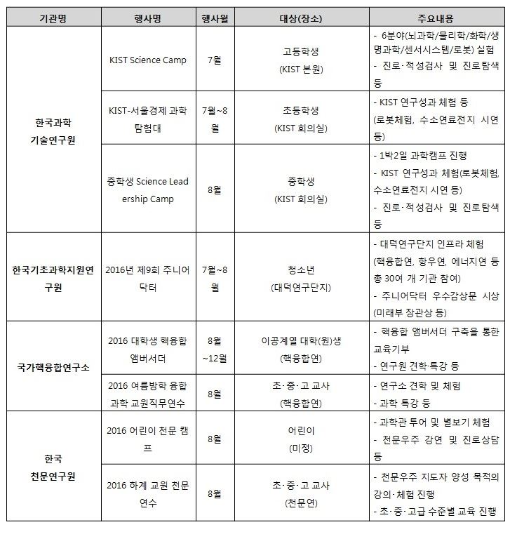 [아시아경제 정종오 기자] 여름방학을 과학과 함께 보낼 수 있는 행사가 다양하게 열린다. 드론에 장착된 카메라로 가상현실을 경험할 수 있다. 3D프린팅으로 원하는 그림을 직접 재현해 보는 등 물놀이를 가지 않고도 여름을 시원하게 즐길 수 있다.국가과학기술연구회(이사장 이상천, 이하 NST)는 여름방학을 맞아 소관 출연연구기관(이하 출연연)이 개최하는 다양한 과학문화 프로그램을 공개했다. 재료연구소는 전국의 청소년을 대상으로 '재료야놀자'(7월~8월)를 개최한다. 온도에 따라 형체가 달라지는 형상기억합금의 원리를 배울 수 있다. 직접 원하는 모양으로 만들어 볼 수 있다. 또 카메라가 장착된 드론을 하늘에 띄워 구현되는 영상을 통해 가상현실을 경험하는 등 다양한 재료를 활용한 체험 행사가 마련됐다. 국가핵융합연구소는 '핵융합 앰베서더'(8월~12월)를 구축해 교육기부 활동을 진행한다. 대상은 이공계와 교육 관련 대학(원)생이다. 핵융합 분야 전문가 특강은 물론 '플라즈마 발생기 만들기', '코일터널을 지나는 건전지 기차' 등의 체험프로그램을 마련했다. 매년 인기를 끌었던 한국기초과학지원연구원의 '주니어 닥터'(7월~8월)가 올 해 더욱 풍성해졌다. 전국의 아동들과 청소년을 대상으로 하는 주니어닥터는 지난해 9200여 명이 참가할 만큼 국내 대표적 과학체험 행사로 자리 잡았다. 한국기계연구원의 '자기부상 풍력 자동차 제작', 한국에너지기술연구원의 '빛으로 에너지 만들기', 한국지질자원연구원의 '퇴적암 타임캡슐 만들기' 등 총 34개 기관에서 400회 이상의 프로그램을 운영한다. 1박 2일 동안 열리는 과학 체험캠프도 마련됐다. 전국 중학생을 대상으로 한 한국과학기술연구원의 'Science Leadership Camp'(8월)와 고등학생을 대상으로 한 한국생산기술연구원의 'KITECH 여름방학 과학캠프'(8월)가 있다. 한국생산기술연구원은 '3D프린팅 체험' 시간을 마련해 자신이 그린 그림을 직접 3D프린팅으로 재현해 볼 수 있는 기회를 제공한다. 한국과학기술연구원의 경우 별도의 전원장치 없이도 촉매를 통해 발생하는 수소를 연료 전지에 연결해 동력 발생 원리를 알아보는 '수소연료전지시연'을 준비했다. 이상천 이사장은 "어린이들에게 과학의 흥미를 심어주기 위한 가장 좋은 방법은 과학을 즐길 수 있도록 하는 것"이라며 "출연연에서 준비한 과학체험이 즐겁고 유익한 시간이 되고, 이를 통해 과학자의 꿈을 키우는 계기가 되길 바란다"고 전했다. 올여름 방학에 진행되는 과학문화 프로그램에 대한 자세한 정보는 출연연 홈페이지를 통해 확인할 수 있다.