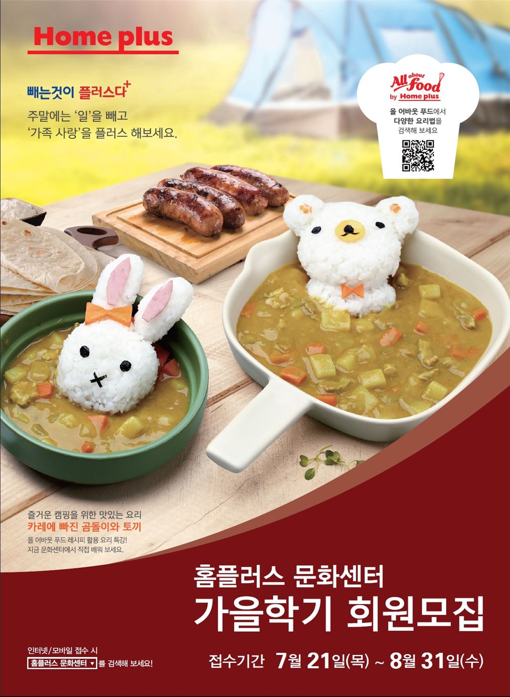 21일부터 전국 125개 문화센터에서 가을학기 회원 모집가을 캠핑요리 강좌 개설, 요리법을 캠핑장에서도 볼 수 있도록 레시피 모바일앱 연계[아시아경제 조호윤 기자]홈플러스 문화센터는 오는 21일부터 가을학기 회원을 모집한다. 이번 가을학기는 가을맞이 캠핑요리 강좌를 비롯해 홈플러스에서 구매 가능한 상품 브랜드와 연계한 콜라보 강좌, 건강을 챙기기 위한 운동 강좌 등 다양한 강좌를 준비했다.캠핑에 대한 수요가 높은 계절인 가을을 맞아 캠핑요리 강좌를 마련했다. 특히 이번 강좌는 홈플러스 트렌디 레시피 매거진 사이트인 올어바웃푸드(AAF)와 연계, 캠핑장에 가서도 문화센터에서 배웠던 요리법을 올어바웃푸드 모바일앱을 통해 확인할 수 있도록 했다.이를 통해 단순히 문화센터에서 강좌를 수강하는 것에 그치는 것이 아니라, 실생활에서도 쉽게 응용 가능하도록 만들었다. 캠핑 강좌는 ‘캠핑장에 패밀리가 떴다! 우리아이 행복추억 만들기’라는 테마 아래 캠핑에서 먹을 수 있는 삼시세끼 레시피를 개발해 문화센터에서 부모와 자녀가 함께 배울 수 있도록 준비했다. 또한 고객들이 애용하는 대표 브랜드와 연계한 콜라보 강좌로 종가집, 락앤락과 함께하는 ‘무더위 지친 입맛 살리는 우리집 김치 담그기!’, CJ라이온, P&G오랄비와 함께하는 ‘우리가족 치아 건강을 위한 튼튼 치아백서’ 등을 기획했고, 이 외에도 호신술, 탄츠플레이, 주짓수 등 건강과 안전을 챙기며 다이어트 효과도 있는 1석 2조 운동 강좌도 개설한다. 가을학기 강좌는 9월1일부터 11월30일까지 진행하며, 접수(선착순 마감) 및 강좌 관련 자세한 사항 확인은 홈플러스 문화센터 홈페이지 및 매장 내 문화센터 안내데스크를 통해 확인 가능하다.가을학기 개설 기념으로 이달 31일까지 ‘가을학기 회원 모집 소문내기’ 이벤트도 진행, 문화센터 모바일 홈페이지에서 소셜네트워크서비스(SNS) 공유하기 버튼을 클릭해 가장 많이 공유한 고객을 대상으로 가을학기 2만원 무료 수강권을 증정한다.수강신청 시 홈플러스 온라인쇼핑 할인쿠폰을 증정, 온라인쇼핑 내 온라인마트에서 5만원 이상 구매 시 5000원 할인쿠폰을 준다. 해당 쿠폰은 21일부터 9월7일까지 사용 가능하다.조호윤 기자 hodoo@asiae.co.kr<ⓒ세계를 보는 창 경제를 보는 눈, 아시아경제(www.asiae.co.kr) 무단전재 배포금지>