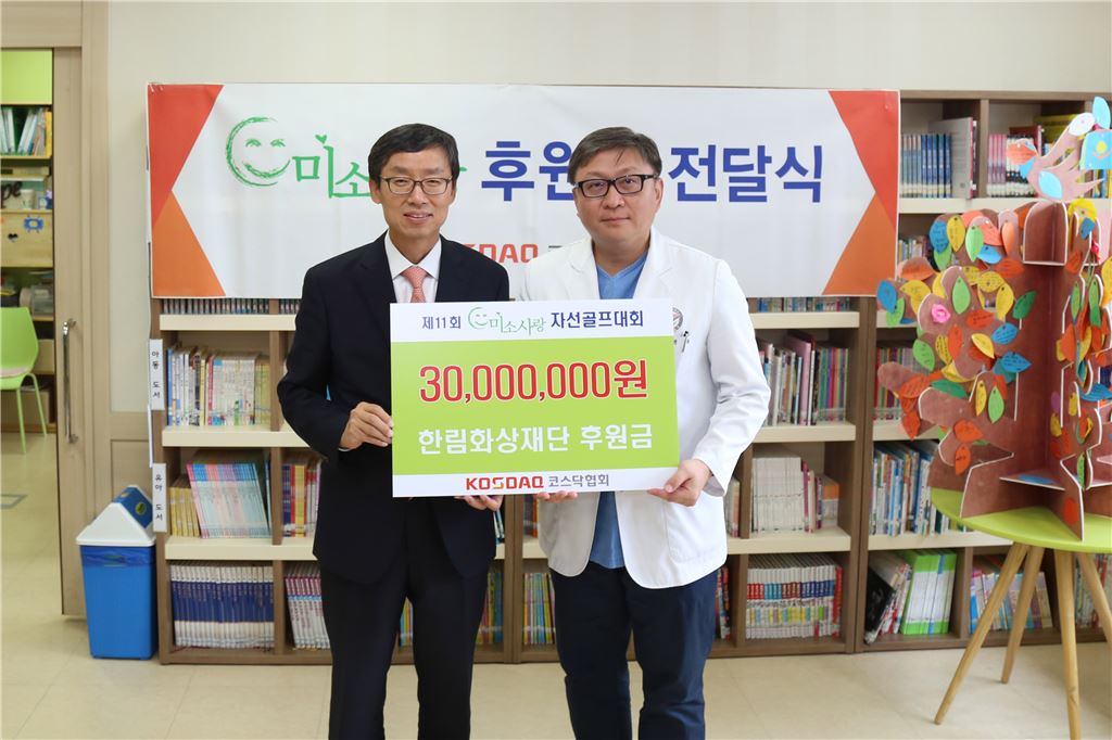 [아시아경제 박선미 기자]코스닥협회가 소외계층 환우 아동의 수술비 마련을 위해 마련한 1억3400만원을 11개 기관에 전달했다.20일 코스닥협회는 지난 5월 개최된 '제11회 미소사랑자선골프대회'를 통해 모금된 1억3400만원을 한림화상재단, 서울성모병원, 서울대어린이병원, 서울시립어린이병원 등 11개 기관에 전달했다.협회는 올해 후원금 포함, 지금까지 약 12억원을 후원하며 형편이 어려워 치료를 받지 못하던 498명의 환우 아동에게 희망을 선물했다. 신경철 코스닥협회 회장은 이번 행사와 관련해 “코스닥기업들의 적극적인 참여와 후원으로 올해도 성황리에 행사를 마치고 후원금을 조성할 수 있었다"며 "형편이 어려운 어린이 환자들과 청소년들에게 지속적으로 사랑을 전할 수 있어 기쁘게 생각한다"고 말했다.박선미 기자 psm82@asiae.co.kr<ⓒ세계를 보는 창 경제를 보는 눈, 아시아경제(www.asiae.co.kr) 무단전재 배포금지>
