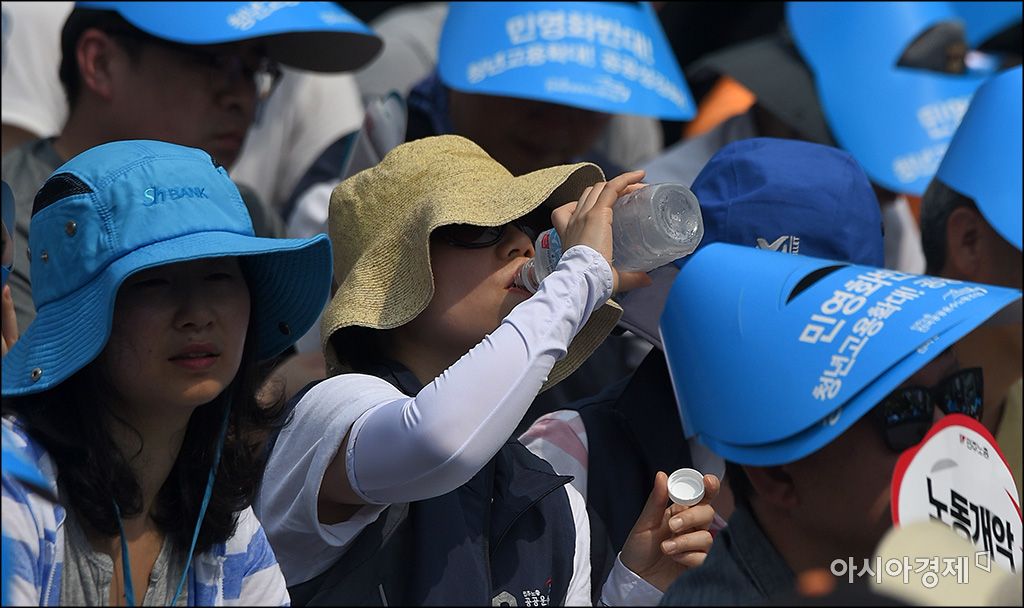 [아시아경제 윤동주 기자] 20일 서울 여의도 산업은행 앞에서 열린 성과연봉제, 조선업계 해고 등 현정부의 노동정책을 비난하는 '1차 총파업-총력투쟁 대회'에 참석한 한 민주노총 소속 조합원이 뜨거운 아스팔트 열기에 지친듯 물을 마시고 있다.윤동주 기자 doso7@asiae.co.kr<ⓒ세계를 보는 창 경제를 보는 눈, 아시아경제(www.asiae.co.kr) 무단전재 배포금지>