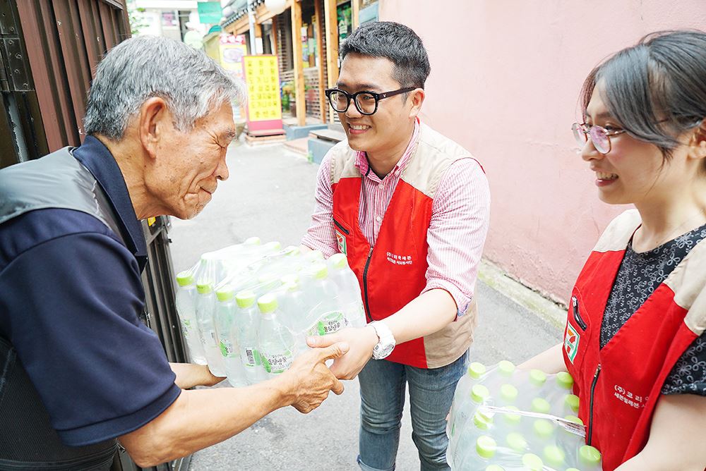20일 오후 세븐일레븐 봉사단원들이 서울역 쪽방촌에 거주하는 어르신에게 생수를 나눠주고 있다.