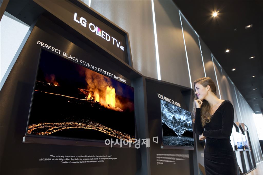 ▲20일(현지시간) 아이슬란드 레이캬비크에서 개최된 자연 풍경 사진전에서 관람객이 아이슬란드 용암을 올레드 TV로 감상하고 있다.(제공=LG전자)