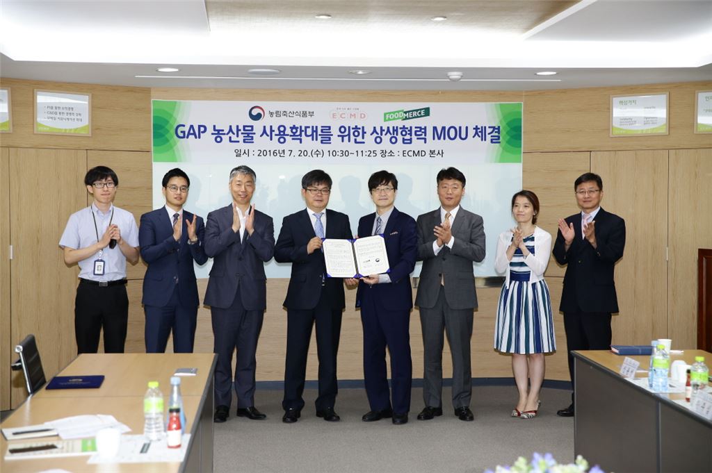 20일 서울시 송파구 이씨엠디 본사에서 농식품부 허태웅 유통소비정책관(왼쪽 네 번째)과 푸드머스 류영기 마케팅본부장(왼쪽 다섯 번째)이 ‘GAP 농산물 사용 확대를 위한 상생협력 MOU'를 체결하고 관계자들과 기념사진을 찍고 있다.
