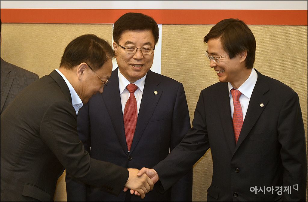 [아시아경제 윤동주 기자] 유일호 경제부총리 겸 기획재정부 장관이 21일 국회에서 열린 세법개정 관련 당정협의에 참석, 조경태 국회 기재위원장과 인사를 나누고 있다.윤동주 기자 doso7@asiae.co.kr<ⓒ세계를 보는 창 경제를 보는 눈, 아시아경제(www.asiae.co.kr) 무단전재 배포금지>