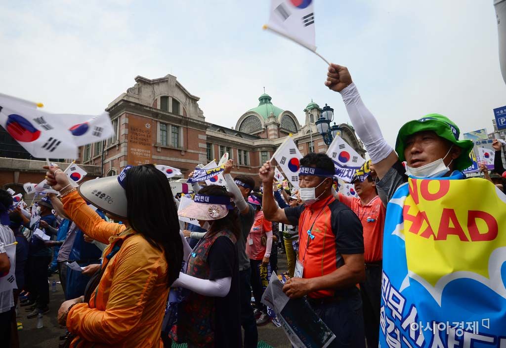 [아시아경제 백소아 기자] 21일 서울 용산구 서울역 앞 광장에서 열린 경북 성주 군민 사드(THADD)배치 반대 상경 집회에서 참가자들이 구호를 외치고 있다.백소아 기자 sharp2046@asiae.co.kr<ⓒ세계를 보는 창 경제를 보는 눈, 아시아경제(www.asiae.co.kr) 무단전재 배포금지>