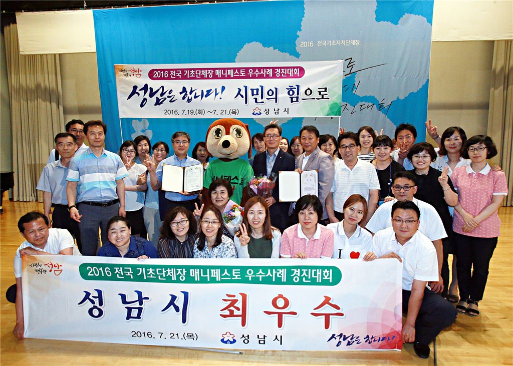 성남시가 전국기초단체장 매니페스토 우수사례 경진대회에서 최우수상을 받았다. 성남시 직원들이 최우수상을 받은 뒤 기념촬영을 하고 있다.