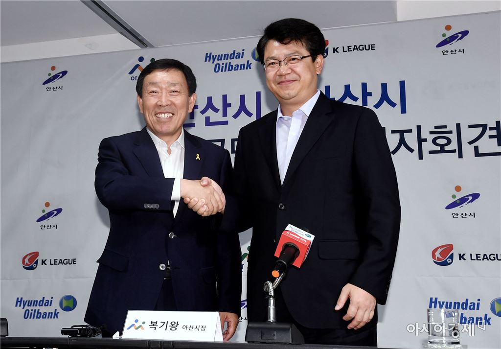 [아시아경제 김현민 기자]안산시·아신시 프로축구단 창단 기자회견이 22일 서울 신문로 축구협회에서 열렸다. 제종길 안산시장(왼쪽)과 복기왕 아산시장이 악수하고 있다. 김현민 기자 kimhyun81@asiae.co.kr<ⓒ세계를 보는 창 경제를 보는 눈, 아시아경제(www.asiae.co.kr) 무단전재 배포금지>