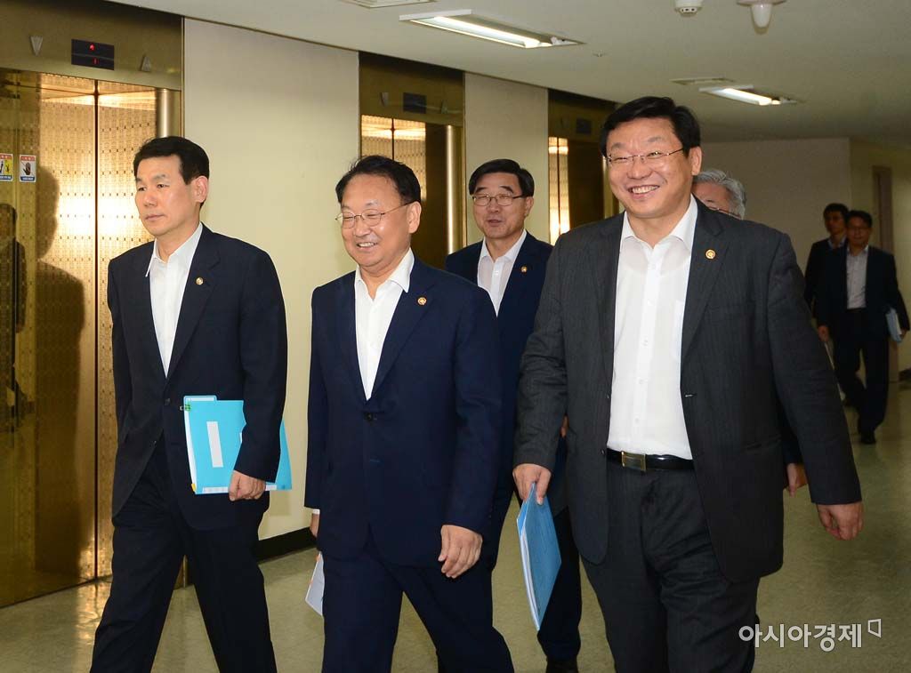 [아시아경제 백소아 기자] 22일 서울 세종로 정부서울청사에서 정은보 금융위원회 부위원장, 이기권 고용노동부 장관, 유일호 경제부총리, 김종덕 문화체육관광부 장관, 주형환 산업통상자원부 장관(왼쪽부터)이 2016 추경 예산안 합동 브리핑을 하기 위해 브리핑룸으로 향하고 있다.백소아 기자 sharp2046@asiae.co.kr<ⓒ세계를 보는 창 경제를 보는 눈, 아시아경제(www.asiae.co.kr) 무단전재 배포금지>