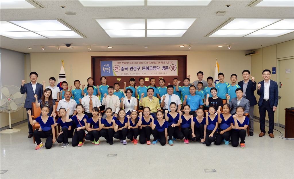 [아시아경제 박종일 기자] 동대문구(구청장 유덕열) 국외 자매결연지인 중국 북경시 연경구 대표단이 22일 오후 1시30분 동대문구청을 방문했다.구청 5층 기획상황실에서 열린 간담회에는 유덕열 구청장, 지구이구 연경구 강장초등학교장 등 46명이 참석해 향후 두 지역 간 문화·체육 교류 방향에 대한 자유로운 이야기를 나눴다.연경구 외사판공실 및 강장초등학교 축구단, 청소년활동센터 무용단으로 구성된 대표단의 방문은 지난해 6월 동대문구 대표단이 연경구를 방문했을 당시 체육교류 사업 추진을 구체적으로 논의하면서 이뤄졌다.