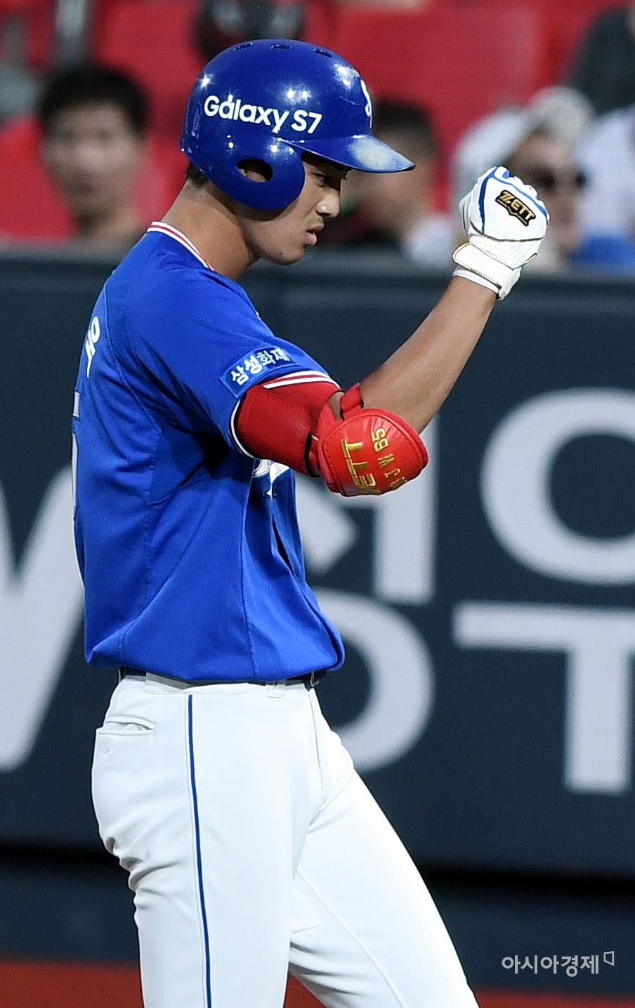 [수원=아시아경제 김현민 기자]프로야구 삼성 라이온즈와 kt 위즈의 2016 KBO리그 경기가 24일 수원구장에서 열렸다. 5회초 2사 1,2루에서 삼성 구자욱이 1타점 적시타를 치고 김평호 코치와 하이파이브하고 있다.김현민 기자 kimhyun81@asiae.co.kr<ⓒ세계를 보는 창 경제를 보는 눈, 아시아경제(www.asiae.co.kr) 무단전재 배포금지>
