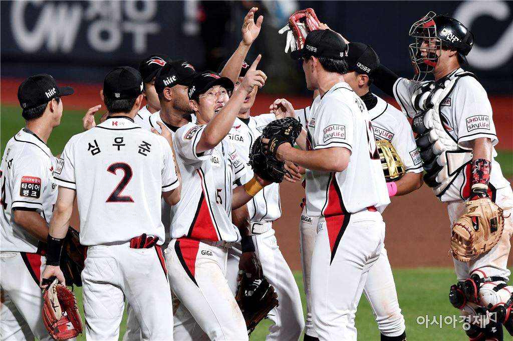 [수원=아시아경제 김현민 기자]프로야구 삼성 라이온즈와 kt 위즈의 2016 KBO리그 경기가 24일 수원구장에서 열렸다. kt 선수들이 2-1 승리를 확정한 뒤 기쁨을 나누고 있다.김현민 기자 kimhyun81@asiae.co.kr<ⓒ세계를 보는 창 경제를 보는 눈, 아시아경제(www.asiae.co.kr) 무단전재 배포금지>