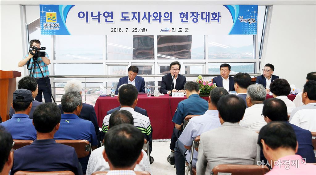 "25일 진도서 도민과 현장대화…국도18호선 녹진 잔여암반 처리 지원 등 약속"[아시아경제 노해섭 기자]이낙연 전라남도지사는 25일 “진도는 전남에서 가장 인구가 적은 군이지만 한편으론 문자 그대로 보배처럼 작으면서도 단단한 고장이다”고 평했다.이 지사는 이날 진도타워 다목적실에서 이동진 군수와 장일 전남도의회의원, 김인정 진도군의회의장, 군민 등 100여 명과 현장 대화의 시간을 갖고 이같이 언급했다.이 지사는 특히 “진도는 역사적으로 삼별초 대몽항쟁의 흔적이 있고, 이순신 장군 대첩을 도와준 곳이며 문화예술에서는 대한민국을 대표할 만한 산처럼 높은 경지를 지닌 곳이기도 하다”며 진도 발전의 비전을 제시했다.이날 군이 건의한 ‘대마도 가고 싶은 섬 가꾸기 사업’지원에 대해 이 지사는 “섬 주민들이 뜻을 모아 ‘가고 싶은 섬’가꾸기에 맞는 사업 계획서를 잘 준비해 제출해 준다면 공정한 심사를 통해 좋은 결과를 얻을 것이다”고 설명했다.또 ‘국립 남종화 역사관 건립’과 관련해서는 “주무 부처인 문화체육관광부는 남종화라는 좁은 장르만으로 국립박물관은 할 수 없다는 입장이므로, 중앙부처를 설득할 수 있는 논리 개발을 통해 내부적으로 조정할 필요가 있다”고 말했다.이어 ‘접도 연도교 신설’은 “도서개발촉진법상 접도가 섬에도 포함되지 않고, 육지에도 포함되지 않아 도서개발 사업에 빠지는 등 법 개정이 필요하다”며 “법 개정을 건의하고, 개정되면 진도군의 요청이 반영되도록 노력하겠다”고 답했다.25일 오후 주민과 현장대화를 위해 진도군을 방문한 이낙연 전남지사가 녹진국민관광단지를 찾아 이동진 진도군수와 진도여행종합안내센터 건립현장을 둘러보고 있다. 사진제공=전남도<br />