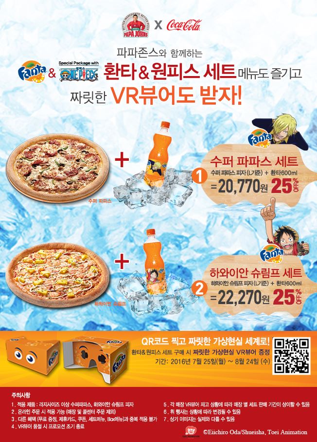 [아시아경제 오주연 기자]파파존스가 여름방학을 맞아 '환타&원피스 VR뷰어 세트' 프로모션을 진행한다고 26일 밝혔다. 이번 행사는 파파존스와 코카콜라가 공동 진행하는 프로모션으로, 파파존스의 인기 피자와 시원한 환타(600ml)를 25% 할인된 가격에 판매한다. 또한 프로모션 메뉴 구매시 가상현실을 즐길 수 있는 VR뷰어를 증정한다. 이벤트 대상 피자는 베스트 메뉴인 수퍼파파스와 신메뉴 하와이안 슈림프 피자로, 라지사이즈 이상 온라인 주문 시 25% 할인 및 VR뷰어 증정 혜택을 받을 수 있다.행사기간은 다음달 24일까지 약 한 달 간 진행되며, 준비된 VR뷰어 수량이 모두 소진될 시 프로모션이 조기 종료될 수 있다.오주연 기자 moon170@asiae.co.kr<ⓒ세계를 보는 창 경제를 보는 눈, 아시아경제(www.asiae.co.kr) 무단전재 배포금지>