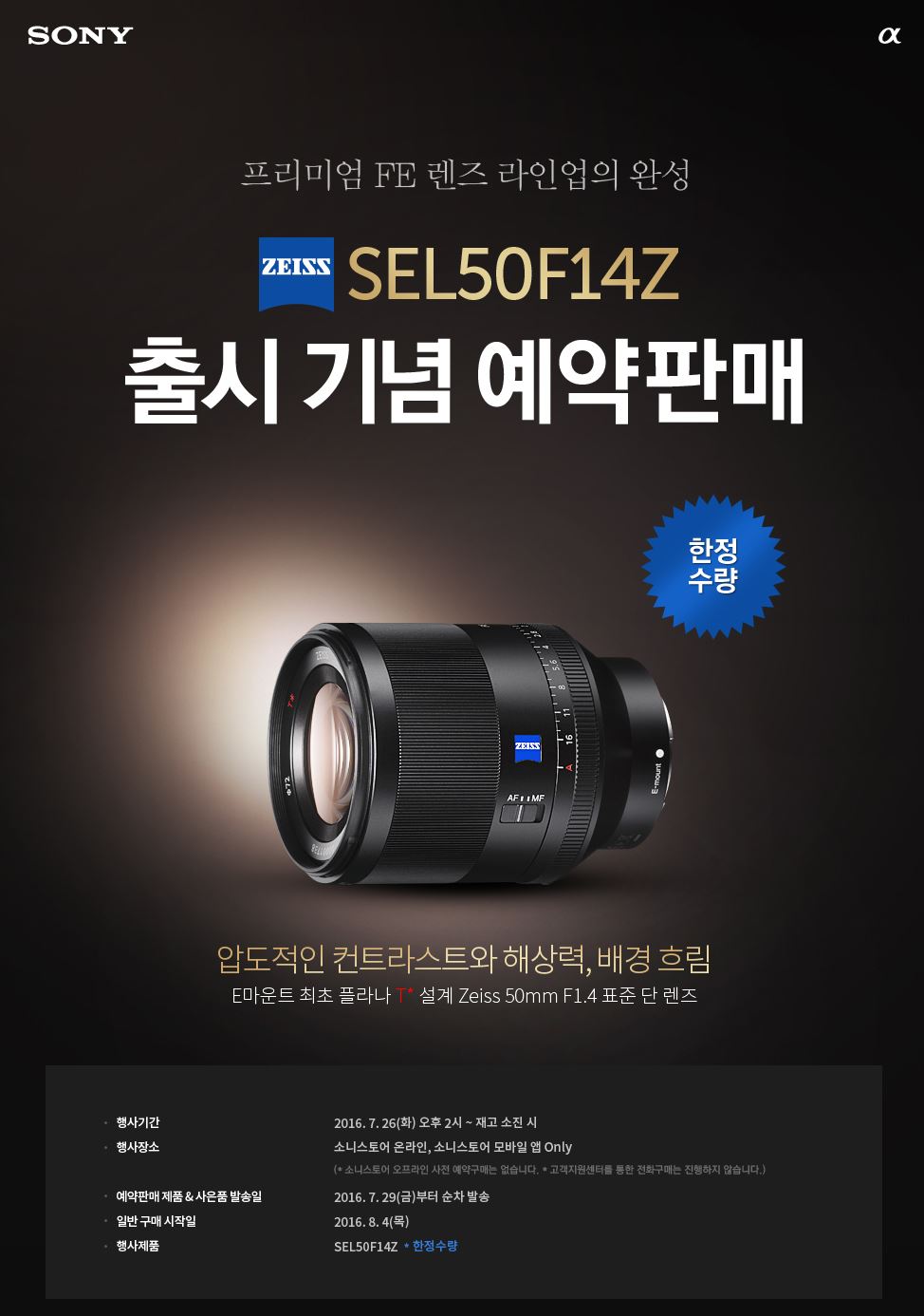 [아시아경제 김유리 기자] 소니코리아는 자사의 풀프레임 미러리스 브랜드인 'A7' 시리즈에 최적화된 칼자이스 50mm F1.4 표준 단렌즈 'SEL50F14Z'를 출시했다고 26일 밝혔다. SEL50F14Z는 세계적인 광학 기업인 칼자이스의 렌즈 브랜드 중 가장 오랜 역사와 전통을 자랑하는 플라나 T 설계를 도입한 최초의 풀프레임 E마운트 렌즈다. F1.4의 밝은 조리개에 기반한 압도적인 컨트라스트와 해상력을 선사한다. SEL50F14Z는 플라나 특유의 렌즈 대칭 구조를 도입해 색 수차를 억제하는 동시에 T 코팅을 더해 플레어 및 고스트 현상을 최소화했다. 11매의 원형 조리개날로 극강의 아름다운 보케(배경 흐림) 효과를 제공해, 피사체에 대한 주목도를 높여 인물사진에 최적화된 렌즈로 통한다. SEL50F14Z는 고해상력 및 수차 보정을 위해 고급 비구면(AA) 및 저분산(ED) 렌즈 포함 총 9군 12매의 렌즈구성 요소로 되어 돼 있다. SSM(Super Sonic Wave Motor) 초음파 모터와 새로운 드라이브 알고리즘을 통해 영상에서도 빠르고 정확하고 조용한 포커싱이 가능하다. 방진방적을 지원하고 있기 때문에 스냅, 인물 등 일상 생활에서는 물론, 여행 및 야외 촬영 시에도 높은 기능성을 제공한다.소니코리아는 SEL50F14Z의 출시를 기념해 26일 오후 2시부터 소니스토어 온라인 홈페이지와 소니스토어 모바일 애플리케이션에서 한정 수량 예약판매를 실시한다. 가격은 199만9000원이다.자세한 내용은 알파 공식 홈페이지와 소니스토어 온라인 홈페이지에서 확인할 수 있다.김유리 기자 yr61@asiae.co.kr<ⓒ세계를 보는 창 경제를 보는 눈, 아시아경제(www.asiae.co.kr) 무단전재 배포금지>