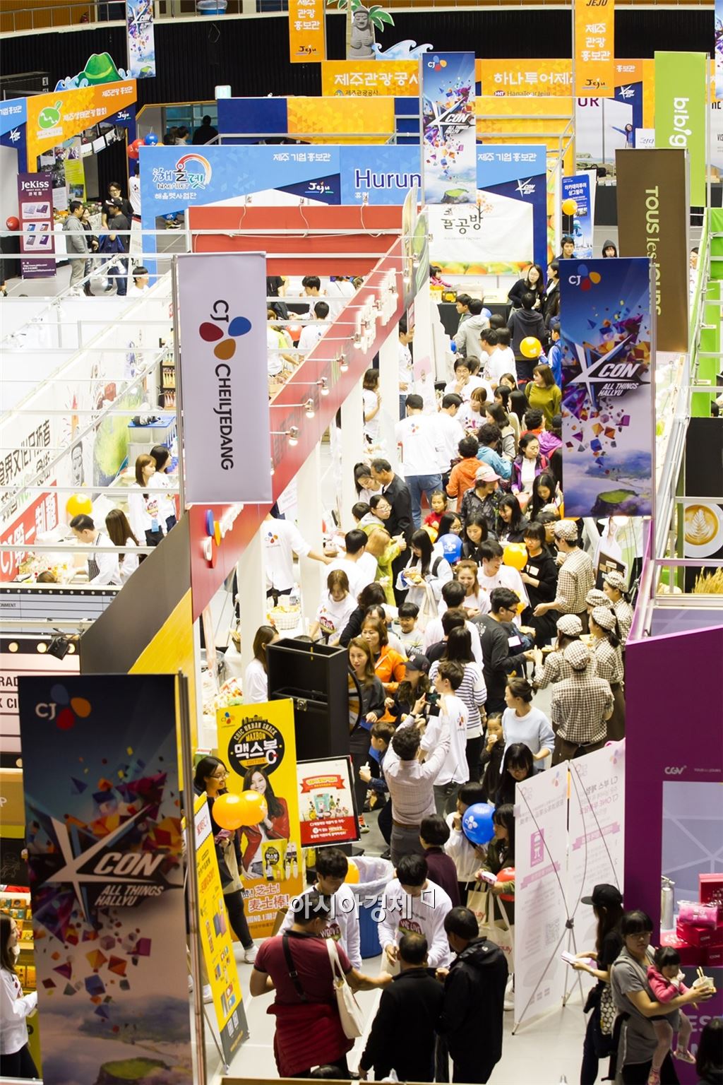 제주 한라체육관에서 진행된 'KCON 2015' 컨벤션에서 관람객들이 K컬쳐와 제주의 다양한 문화를 체험하며 즐기고 있다.