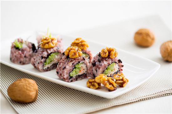 재료(1인분)흑미밥 1공기, 오이 1/2개. 게맛살 2줄, 마요네즈 2, 김 1장, 호두 1/4컵단촛물식초 2, 설탕 1, 소금 0.3 호두조림간장 1, 물엿 1, 맛술 0.5, 물 2만들기▶ 요리 시간 25분1.단촛물 재료를 섞어서 설탕, 소금이 녹도록 저어준 후 흑미밥에 넣어 골고루 섞는다.<br />