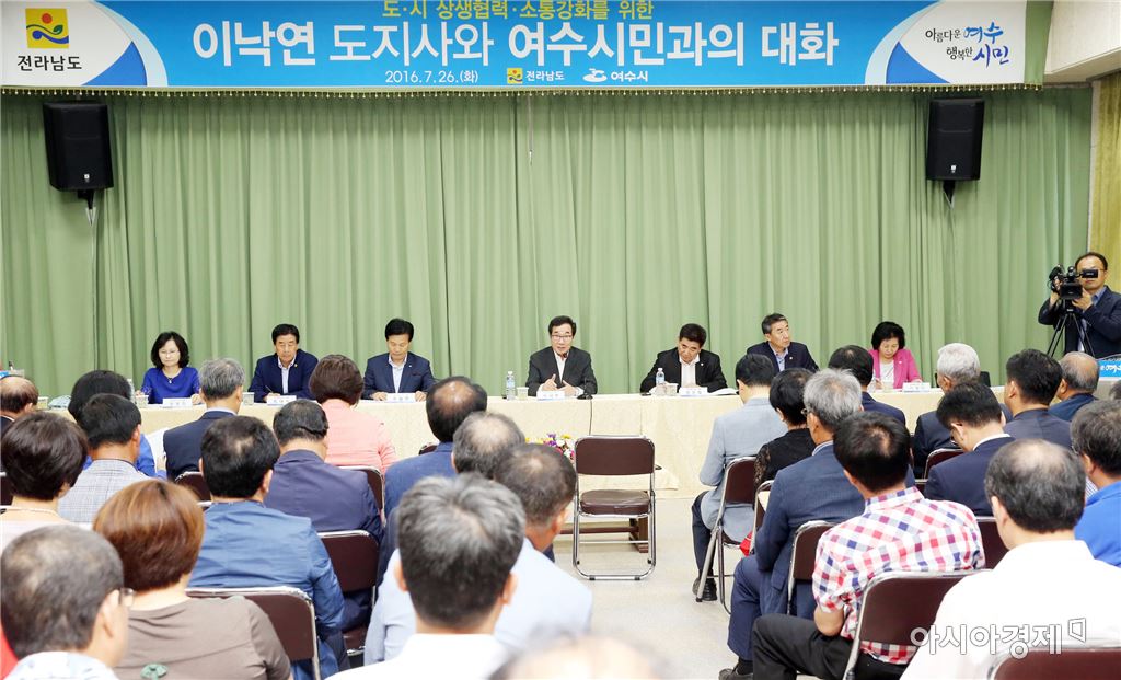 "여수서 도민과 현장대화…돌산대교 서측 자전거도로 개설 지원 등 약속"[아시아경제 노해섭 기자]이낙연 전라남도지사는 26일 “포항의 철강이나 석유화학, 울산의 자동차, 거제의 조선산업들이 위기를 맞고 있으나 여수는 석유화학이 이변이라 할 만큼 흑자를 내는 놀라운 일을 만들어 내고 있다”고 평했다.이 지사는 이날 여수 돌산읍 우두출장소에서 주철현 시장과 윤문칠, 최대식, 서정한, 이경미, 서일용, 주연창, 강정희 전남도의회의원, 박정채 시의회의장, 시민 등 100여 명과 현장 대화의 시간을 갖고 이같이 언급했다.이 지사는 특히 “여수는 석유화학 분야 경기 하강 국면이 현실화되기 전에 관광이라는 새로운 출로를 만드는 놀라움을 보여줬다”며 “석유화학이 잘 버텨주고, 여기에 바이오케미칼 등 신산업으로 외연을 확대한데다 관광이라는 미래형 산업을 멋들어지게 성공, 지난 한 해 제주도 관광객 수보다 8만 명 적은 1천 358만 명을 기록했다”고 말했다.이날 시가 건의한 ‘돌산대교 서측 자전거도로 개설’지원에 대해 이 지사는 “이곳은 아름다운 구간으로, 앞으로 사업이 차질 없이 제때 완료되도록 부족분에 대해 최선을 다해 돕겠다”고 답했다. 또 ‘국립기상과학관 건립 유치’와 관련해서는 “기상과학관은 대통령 공약사항인데도 지켜지지 않고 있다”며 “그러나 기상청에서는 필요하다고 보고 이미 55억 원의 예산을 기재부에 요청했으나 반영이 되지 않고 있다. 내년 정부 예산이 확정되는 시점까지 끝까지 노력하겠다”고 설명했다.이낙연 전남지사가 26일 오후 국제해양관광의 중심 여수시를 방문, 주철현 여수시장(왼쪽) 안내로 돌산읍 우두리 진모지구 유ㆍ청소년 스포츠체험센터 유치예정지를 둘러보고 있다. 사진제공=전남도