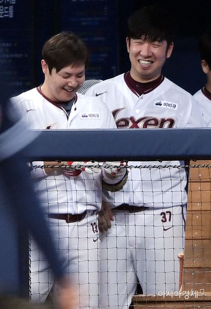 [아시아경제 김현민 기자]프로야구 두산 베어스와 넥센 히어로즈의 2016 KBO리그 경기가 27일 서울 고척스카이돔에서 열렸다. 4회말 무사 만루에서 넥센 윤석민이 두산 투수 조승수를 상대로 추가 만루 홈런을 치고 선발 신재영과 기뻐하고 있다. 김현민 기자 kimhyun81@asiae.co.kr<ⓒ세계를 보는 창 경제를 보는 눈, 아시아경제(www.asiae.co.kr) 무단전재 배포금지>