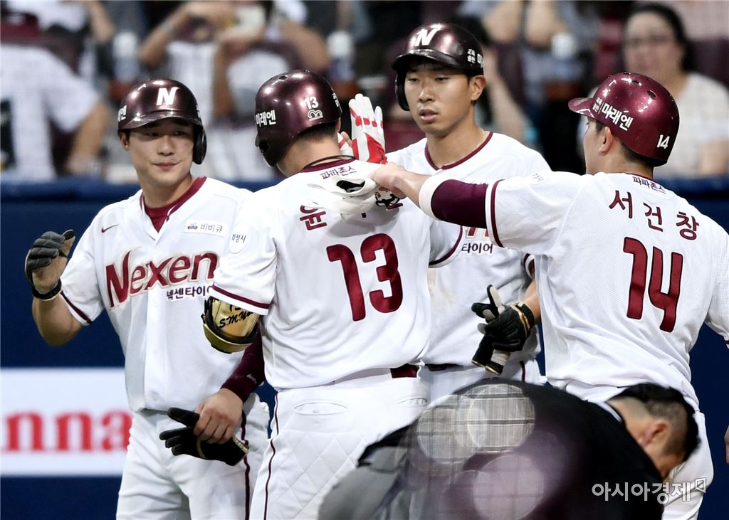 [아시아경제 이윤화 인턴기자] 프로야구 넥센 히어로즈가 윤석민의 시즌 13호 만루포로 두산 베어스에 전날 패배를 설욕했다. 넥센은 27일 고척 스카이돔에서 열린 2016 타이어뱅크 KBO 리그 두산과의 홈경기에서 9-4로 이겨 전날 1-7 완패를 되갚았다. 최근 2연패도 탈출하면서 52승1무40패로 순위는 3위를 유지했다. 선두 두산은 2연승을 마감했다. 상위권 팀의 승부답게 초반 흐름은 난타전이었다. 넥센은 10승 투수 신재영, 두산은 9승 투수 유희관을 선발로 세웠다. 그러나 1회부터 두 팀의 득점이 폭발했다. 윤석민의 그랜드슬램이 팽팽하던 경기 분위기를 바꿨다. 그는 팀이 5-4로 앞선 4회말 상대투수 조승수를 상대로 중월 만루홈런을 쳤다. 무사 만루에서 두산 불펜 조승수의 2구째 시속 131㎞짜리 슬라이더를 공략했다. 비거리 125m.넥센 선수단이 만루홈런을 친 윤석민을 축하하고 있다.[사진=김현민 기자]