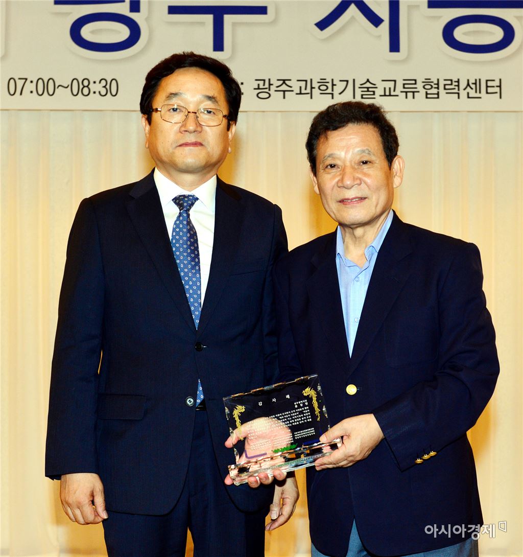 [아시아경제 노해섭 기자]윤장현 광주광역시장은 28일 오전 과학기술교류협력센터에서 열린 제1회 광주 자동차포럼에 참석해 신재봉 부품산업육성협의체 대표로부터 자동차산업 육성을 위한 열정, 성과에 대한 10개 협의체 회원의 뜻을 담은 감사패를 전달받고 기념촬영을 하고있다.사진제공=광주시 <ⓒ세계를 보는 창 경제를 보는 눈, 아시아경제(www.asiae.co.kr) 무단전재 배포금지>