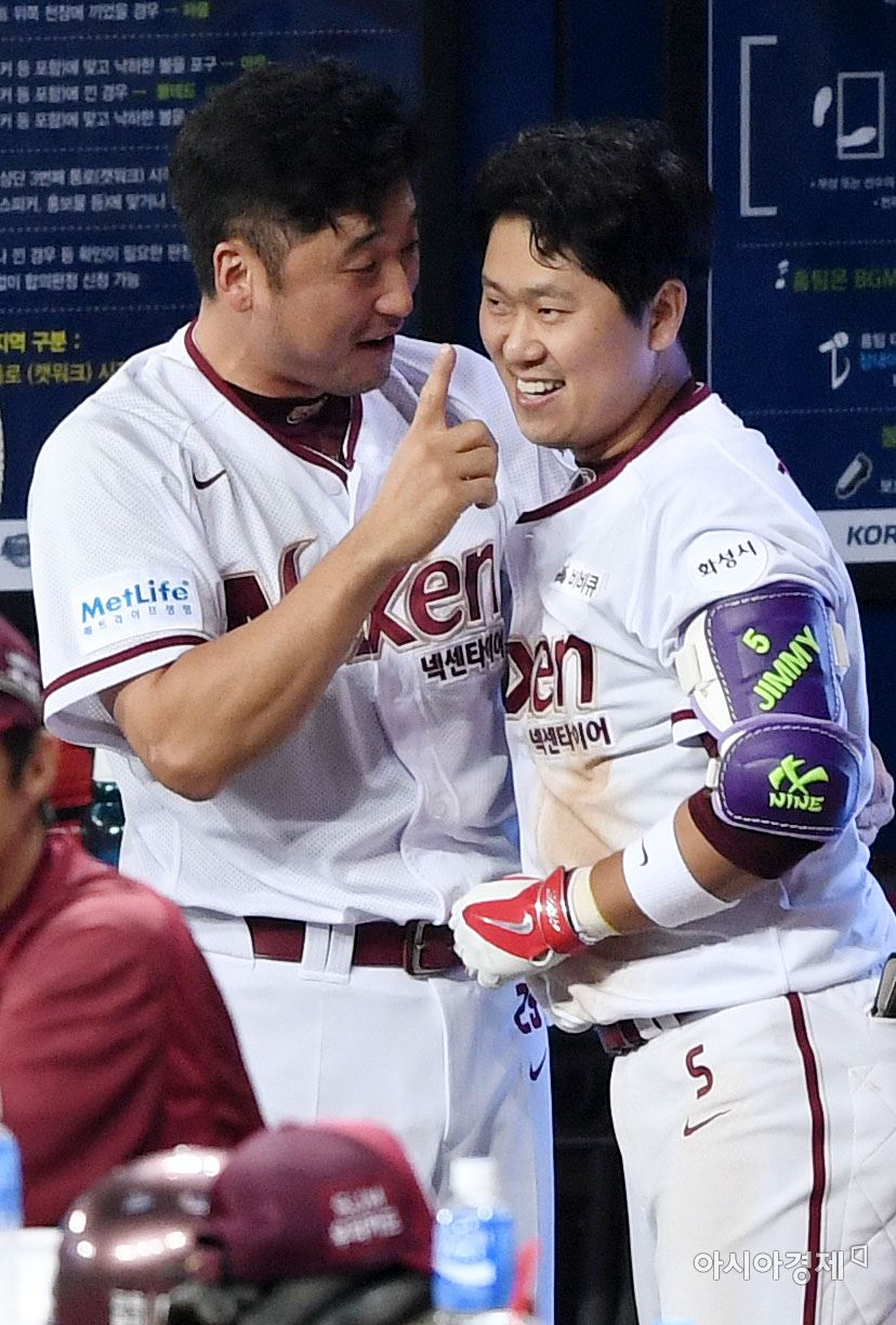 [아시아경제 김현민 기자]프로야구 두산 베어스와 넥센 히어로즈의 2016 KBO리그 경기가 28일 서울 고척스카이돔에서 열렸다. 6회말 넥센 선두타자 김지수가 상대 진야곱을 상대로 솔로 홈런을 치고 이택근과 기뻐하고 있다. 김현민 기자 kimhyun81@asiae.co.kr<ⓒ세계를 보는 창 경제를 보는 눈, 아시아경제(www.asiae.co.kr) 무단전재 배포금지>