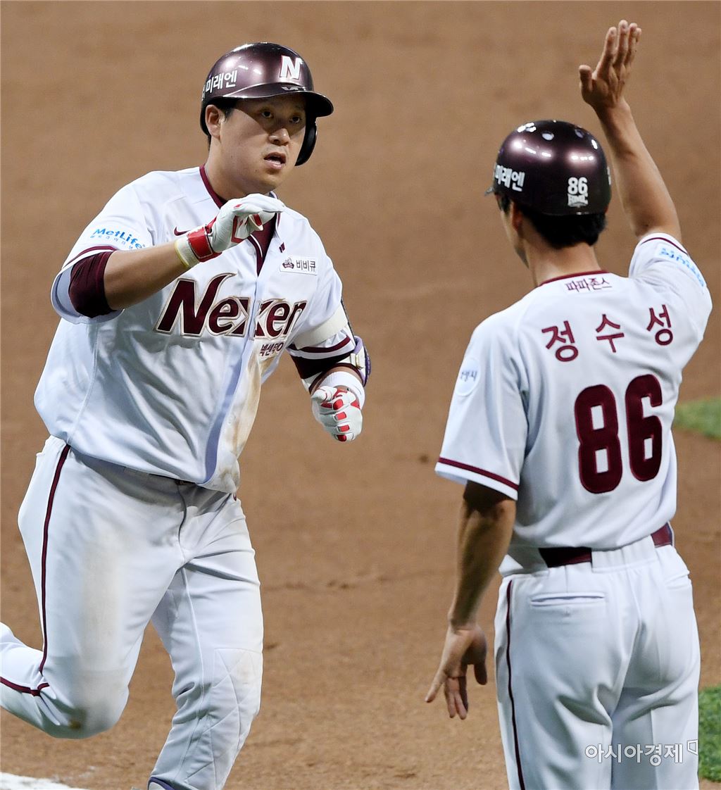 [아시아경제 김현민 기자]프로야구 두산 베어스와 넥센 히어로즈의 2016 KBO리그 경기가 28일 서울 고척스카이돔에서 열렸다. 6회말 넥센 선두타자 김지수가 상대 진야곱을 상대로 솔로 홈런을 치고 정수성 코치와 하이파이브하고 있다. 김현민 기자 kimhyun81@asiae.co.kr<ⓒ세계를 보는 창 경제를 보는 눈, 아시아경제(www.asiae.co.kr) 무단전재 배포금지>