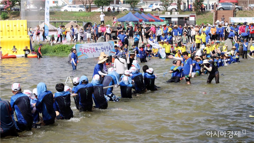 [아시아경제 노해섭 기자] 찜통더위가 기승을 부리고 있는 가운데 31일 제9회 정남진 장흥 물축제를 찾은 주민들이 탐진강 물속에서 수상줄다리기를 벌이고 있다. 장흥 고싸움의 전통을 상징하는 수중 줄다리기는 화합과, 단결, 어울림 등의 의미를 담은 물축제의 대표 프로그램이다.노해섭 기자 <ⓒ세계를 보는 창 경제를 보는 눈, 아시아경제(www.asiae.co.kr) 무단전재 배포금지>