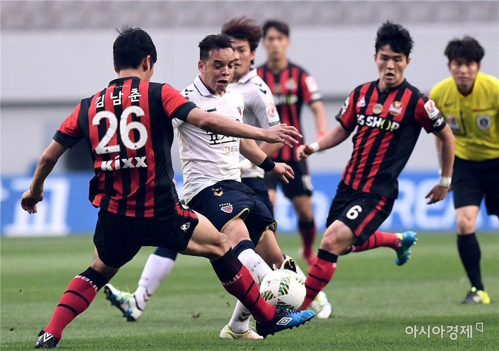 [아시아경제 김현민 기자]프로축구 FC서울과 포항 스틸러스의 2016 K리그 클래식 경기가 31일 서울월드컵경기장에서 열렸다. 포항 롤리냐가 서울 김남춘과 공을 다투고 있다. 김현민 기자 kimhyun81@asiae.co.kr<ⓒ세계를 보는 창 경제를 보는 눈, 아시아경제(www.asiae.co.kr) 무단전재 배포금지>