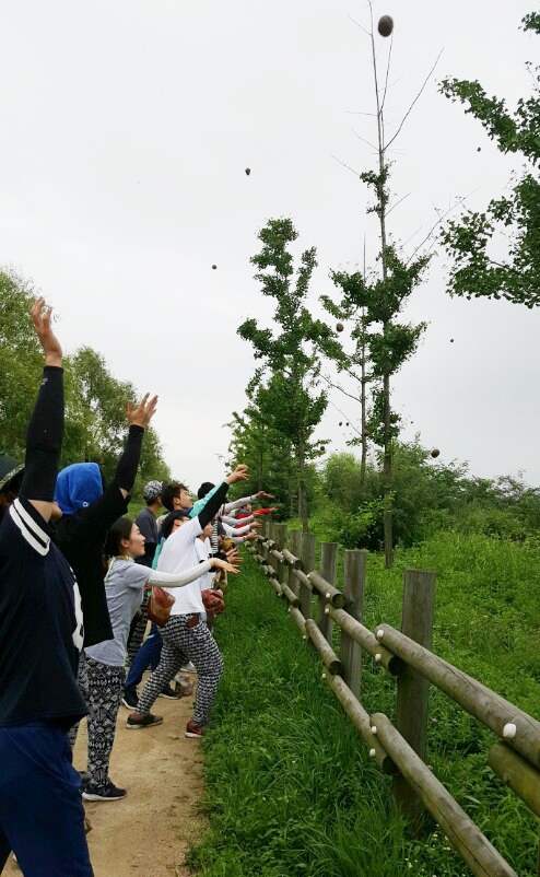 CJ헬스케어 신입사원들이 지난 달 29일 서울 마포구 월드컵공원 내 노을공원서 도시 숲 조성을 위해 나무 씨앗이 담긴 흙 공을 던지고 있다.