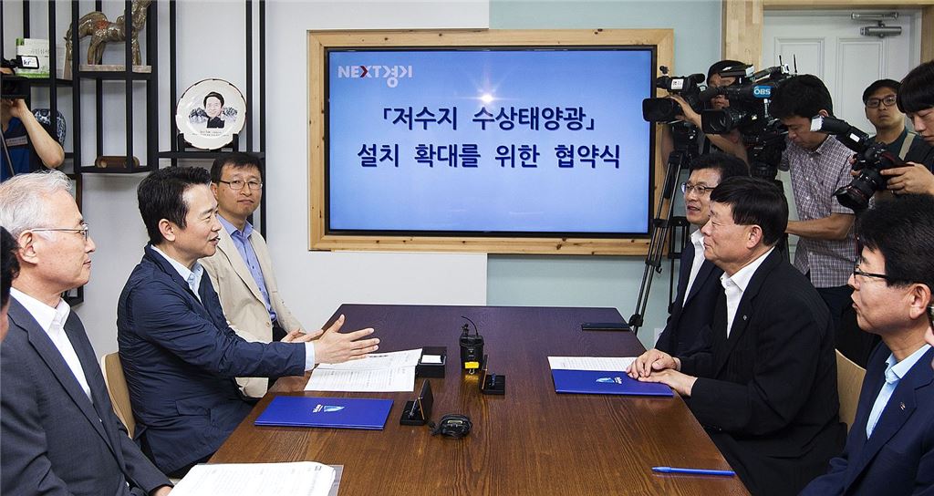 남경필 경기지사(왼쪽 두번째)가 이상무 한국수자원공사 사장과 '저수지 수상태양광 설치 확대를 위한 협약'을 체결한 뒤 환담하고 있다.