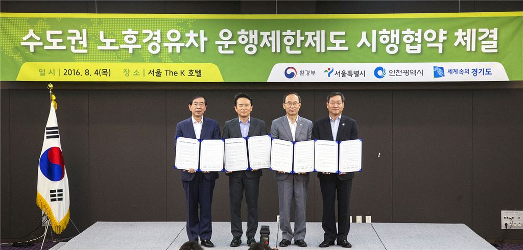 수도권 노후경유차 운행제한제도 시행협약을 체결한 뒤 박원순 서울시장, 남경필 경기지사, 윤성규 환경부장관, 유정복 인천시장(왼쪽부터)이 기념촬영을 하고 있다.