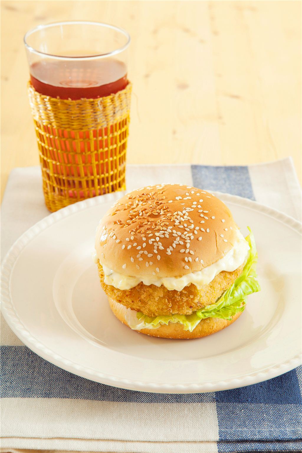5. 햄버거 빵에 양상추와 새우 패티, 타르타르소스, 양상추를 얹고 햄버거 빵을 덮는다.