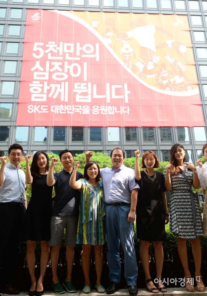 [아시아경제 백소아 기자] 리우올림픽 개막을 이틀 앞둔 4일 서울 종로구 SK그룹사옥에 걸린 올림픽 응원 대형 현수막 앞에서 SK직원들이 대한민국 선수단의 선전을 기원하며 화이팅을 외치고 있다. 백소아 기자 sharp2046@asiae.co.kr<ⓒ세계를 보는 창 경제를 보는 눈, 아시아경제(www.asiae.co.kr) 무단전재 배포금지>