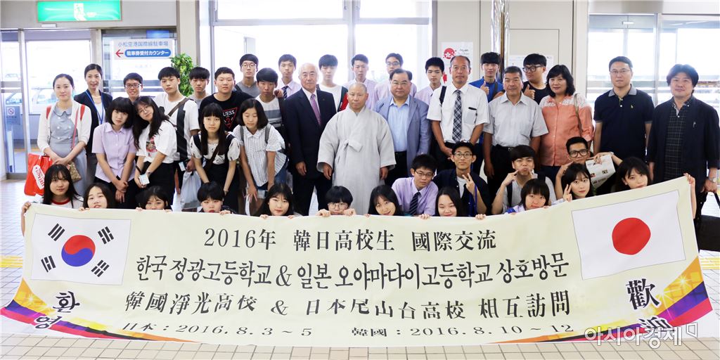 "한·일 청소년의 우호적 평화적 교류 활동 12년 " [아시아경제 노해섭 기자]학교법인 정광학원(이사장 원일스님)의 정광고등학교(교장 임형칠)는 지난 3일부터 5일까지 2학년 학생 25명과 지도교사 5명이 일본 이사카와 (石川)현 가나자와시 오야마다이고등학교에서 한·일 교사 및 학생들의 우호적 평화적 국제교류 프로그램을 진행했다.이번 정광고 학생들은 3일 일본 이시카와현의 겐로쿠엔(兼六園)과 가나자와성의 견학을 통해 일본 에도 시대 문화와 역사를 접했다.특히 이날 일본 측 환영회에서는 각자 상대국의 언어로 자신을 소개하고, 홈스테이를 하게 될 오야마다이고 1·2학년 학생과 양국의 생활과 문화에 대해서 이야기를 나누었다. 4일에는 오야마다이고등학교를 방문해 강당, 다실, 교실, 일본 전통극 노(能)공연장 등을 살펴보고, 여름방학 중임에도 취주악부, 검도부 학생들의 동아리활동 모습을 견학했다. 오후에는 가나자와시의 청소년 연수센터에서 양국 학생들이 축구, 댄스, 전통 놀이 등을 함께하며 언어와 국경을 넘어 스스럼없이 상호 소통하고 우정을 쌓는 시간을 보냈다. 5일에는 일본 국제 고마쓰 공항에서 환송식을 갖고 이별을 아쉬워하며 이번 달 8월 10일~12일 에 광주 정광고등학교에서 일본 오야마다이고 학생들과 다시 만날 것을 기약했다.