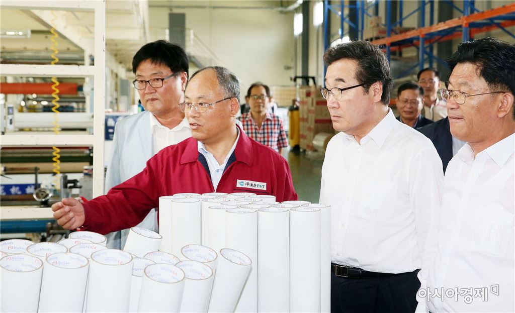 이낙연 전남지사가 8일 오후 나주시 친환경테이프 생산기업 ㈜호산P&T를 방문, 이인호 대표이사, 강인규 나주시장, 김옥기·이민준 도의원과 생산시설을 둘러보고 있다. 사진제공=전남도