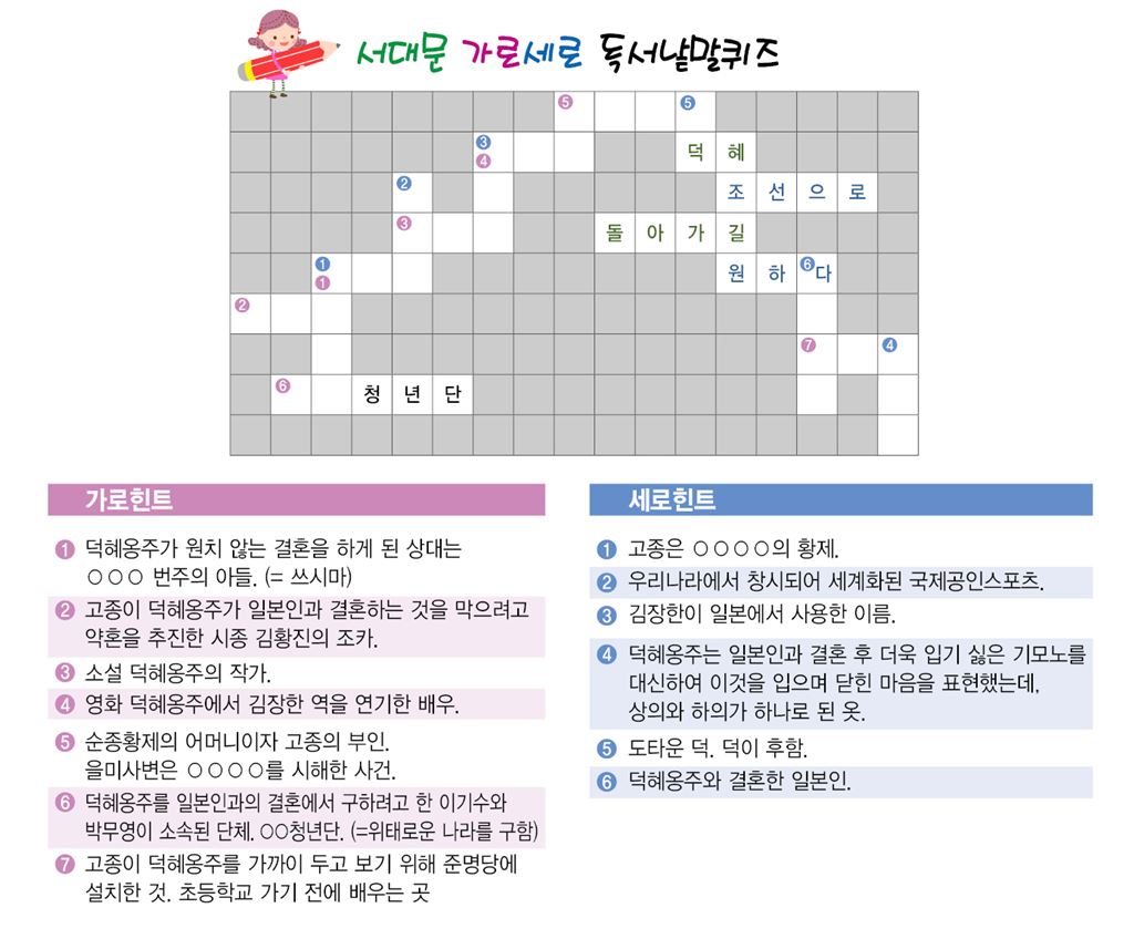 [아시아경제 박종일 기자] 서대문구(구청장 문석진)가 독서에 대한 지역 사회의 관심을 높여 ‘책 읽는 서대문’을 구현하기 위해 ‘서대문 가로세로 독서낱말퀴즈’ 프로그램을 운영한다.이 프로그램은 월별로 정해지는 책을 읽고 가로세로 낱말퀴즈를 푸는 것으로 누구나 참여할 수 있다.퀴즈는 주로 해당 도서의 내용, 주인공, 장소 등에 관한 것으로 책을 읽으면 쉽게 풀 수 있도록 출제한다.구는 매월 60점 이상 얻은 응모자 가운데 20명을 추첨해 1만원 상당의 도서상품권을 증정한다.‘서대문 가로세로 독서낱말퀴즈’와 그 달의 도서는 서대문구 홈페이지 ‘알림판’과 매월 발행되는 구정 소식지 ‘서대문마당’에 실린다.