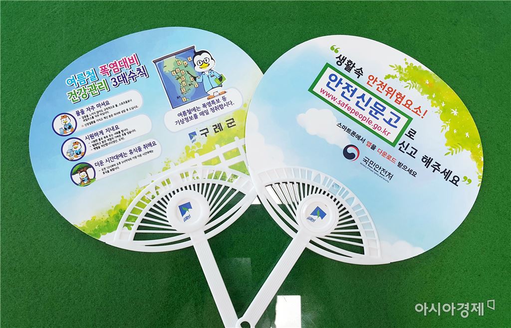 "폭염대비 행동요령 홍보물 및 부채 제작 배부"[아시아경제 이진택 기자]구례군은 연일 폭염이 지속되자 피해 예방을 위해 폭염 발생 시 행동요령 안내 홍보물 4,000매 및 부채 3,000여 개를 제작하여 경로당 등 무더위쉼터에 비치했다.제작된 부채에 폭염특보 발령 시 ‘무더위 쉼터’이용, 실내적정온도 유지, 낮 12시부터 오후 5시 사이에 야외작업 자제 등 여름철 폭염대비 건강관리 3대 수칙 및 행동요령 등을 실어 군민들이 쉽게 알아볼 수 있도록 제작했다.한편, 군은 9월 30일까지 폭염대책기간으로 정하고 폭염대응 T/F팀을 구성하여 운영하고 있으며, 폭염특보 발효 시 독거노인 등 폭염취약계층에게 외출 및 야외활동을 자제해 달라는 안내 문자를 발송하는 등 안전사고 예방활동을 강화하고 있다.군 관계자는 “기상청의 기상전망에 의하면 올여름은 뜨겁고 건조한 이동성 고기압으로 인해 극심한 무더위가 당분간 지속될 것으로 전망된다”며 “각 가정에서도 폭염대비 개인생활 수칙 준수에 적극 동참해 줄 것”을 당부했다. 이진택 기자<ⓒ세계를 보는 창 경제를 보는 눈, 아시아경제(www.asiae.co.kr) 무단전재 배포금지>