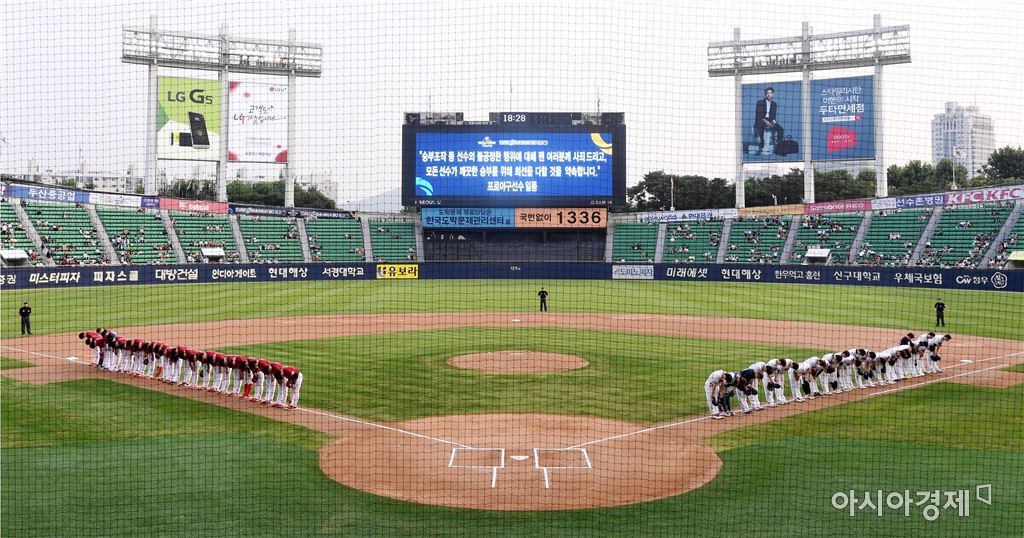 [아시아경제 김현민 기자]프로야구 KIA 타이거즈와 두산 베어스의 2016 KBO리그 경기가 9일 잠실구장에서 열렸다. 경기에 앞서 양팀 선수단이 머리숙여 승부조작 관련 사과를 하고 있다. 김현민 기자 kimhyun81@asiae.co.kr<ⓒ세계를 보는 창 경제를 보는 눈, 아시아경제(www.asiae.co.kr) 무단전재 배포금지>