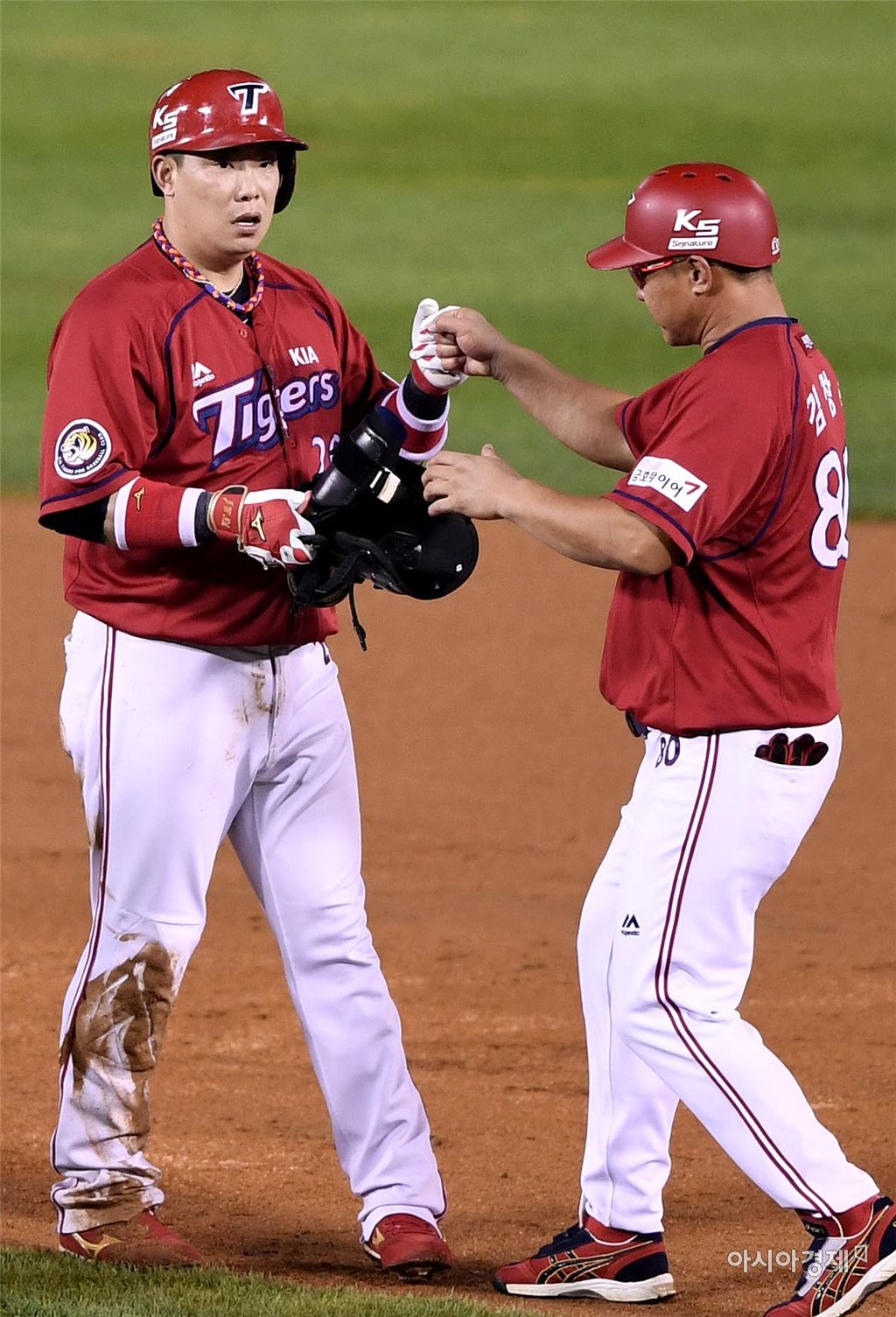 [아시아경제 김현민 기자]프로야구 KIA 타이거즈와 두산 베어스의 2016 KBO리그 경기가 9일 잠실구장에서 열렸다. 8회초 1사 2,3루에서 KIA 나지완이 2타점 2루타를 치고 김창희 코치와 하이파이브하고 있다. 김현민 기자 kimhyun81@asiae.co.kr<ⓒ세계를 보는 창 경제를 보는 눈, 아시아경제(www.asiae.co.kr) 무단전재 배포금지>