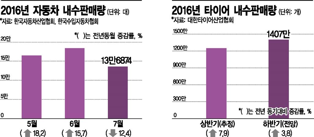 [아시아경제 김대섭 기자] 자동차에 이어 타이어 업계도 '내수 절벽'에 직면했다. 개별소비세 인하 혜택이 지난 6월 끝난데다 노후 경유차 교체 지원 정책도 자꾸 늦춰지면서 대기 수요가 발생한 결과다. 글로벌 자동차 시장의 저성장 기조가 지속되면서 수출까지 감소할 전망이어서 안팎에서 위기를 겪고 있다.10일 대한타이어산업협회 보고서에 따르면 하반기 타이어 내수ㆍ수출 판매량은 4554만개로 상반기 4809만대(추정)와 비교해 5.3% 감소할 전망이다. 전년 동기 대비 3.2% 감소한 수치다. 연간 판매는 9363만개로 전년 대비 2.4% 줄어들 것으로 예상된다. 내수판매도 성장이 약화됐다. 상반기 판매는 전년 동기 대비 7.9% 증가했지만 하반기에는 3.8% 늘어나는데 그칠 것으로 보인다. 하반기 수출은 전년 동기 대비 5.8% 감소할 전망이다. 타이어산업협회 관계자는 "개소세 인하 종료에 따른 신차 판매 감소로 성장 약세가 예상된다"고 말했다.국내 자동차 내수판매도 개소세가 끝나면서 내수절벽과 노조 부분파업 등에 타격을 입었다. 산업통상자원부에 따르면 지난달 내수 판매량은 13만7992대로 전월과 전년동월 대비 각각 25.7%, 12.1% 급감했다. 국산차는 12만654대를 팔아 전월대비 24.5% 감소했다. 전년동월 대비는 9.8% 줄었다. 수입차도 배출가스 조작 등의 여파로 전년 동월과 전월 대비 각각 25.0%, 32.7% 급감했다. 이런 상황에서 현대차 노조가 지난달 연속 부분파업에 이어 이달에도 10일부터 12일까지 파업을 진행할 예정이어서 생산차질에 따른 판매감소가 우려되고 있다. 자동차 내수 절벽이 현실화되고 있지만 정부가 미세먼지 감축과 소비 증진을 위해 지난 6월 내놓은 노후 경유차 교체 지원책은 시행이 지연되고 있다. 신차를 구매할 계획이 있던 소비자들이 제도 시행을 기다리면서 발생하는 대기 수요도 판매 감소에 영향을 주고 있다. 국내 자동차 중 10년 이상된 노후 경유차는 400만대로 이 중 승용차는 100만대 정도로 추산된다. 그러나 이르면 지난달 시행될 것으로 기대됐던 노후 경유차 교체 지원책은 10월 이후에 실시될 것으로 예상된다. 국회 법안 통과가 늦춰지고 있기 때문이다. 승용차에 붙는 개소세를 낮추려면 국회에서 조세특례제한법이 개정돼야 한다. 업계 관계자는 "정부 발표 후 시행까지 단기간에 처리됐어야 효과가 높은데 늦춰지면서 소비자 관심은 다시 시들해지고 있다"며 "개소세 인하 효과도 이미 바닥난 상황에서 하반기 실적이 악화될 것으로 예상된다"고 말했다. 또 다른 관계자는 "정부가 정책을 발표하면서 이미 노후 경유차 폐차 지원 관련 프로모션들을 선보인 곳들도 많은데 소비자들의 문의가 들어와도 판매 현장에 이렇다할 답변을 하지 못하고 있다"고 토로했다.현대차그룹 글로벌경영연구소에 따르면 올 국내 자동차 시장 연간 규모는 2013년 이후 3년 만에 처음으로 감소세로 전환될 것으로 전망됐다. 업체들은 판매 절벽을 극복하기 위해 신차 출시 등 하반기 총력전을 펼치고 있다. 현대차는 지난달부터 선보여 고급차 시장에서 돌풍을 일으키고 있는 제네시스 브랜드의 두 번째 모델 G80의 판매를 확대할 계획이다. 다음달에는 신형 i30 모델도 출시한다. 기아차는 대당 판매단가가 높은 고수익 레저용차량(RV)의 생산 판매 비중을 확대한다. 글로벌경영연구소 관계자는 "정부가 하반기 경기 활성화를 위해 노후 경유차 폐차지원 정책을 추진하고 있지만 이를 통한 판매 순증 효과가 크지 않아 판매 하락세는 극복할 수 없을 것으로 예상된다"고 말했다. 김대섭 기자 joas11@asiae.co.kr<ⓒ세계를 보는 창 경제를 보는 눈, 아시아경제(www.asiae.co.kr) 무단전재 배포금지>