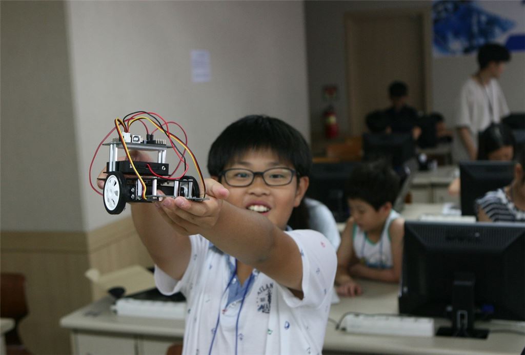 [아시아경제(대전) 정일웅 기자] 한밭대는 9일부터 이틀간 교내에서 ‘제22회 청소년 로봇캠프’를 개최하고 지역 초등학생 120명(일자별 60명씩)에게 로봇 제작 및 구동 등의 체험기회를 제공했다고 10일 밝혔다. 올해로 22회째를 맞이한 이 캠프는 로봇과학 세미나를 시작으로 로봇제작, Logic 프로그램 강의, 로봇프로그래밍, 지능로봇경진대회 등의 프로그램을 진행해 참여 학생들이 로봇에 친숙해질 수 있는 기회를 제공하고 있다. 로봇캠프에 참여한 대전삼육초 학생이 자신이 직접 만든 로봇을 치켜들며 뿌듯해 하고 있다. 한밭대 제공대전=정일웅 기자 jiw3061@asiae.co.kr<ⓒ세계를 보는 창 경제를 보는 눈, 아시아경제(www.asiae.co.kr) 무단전재 배포금지>정일웅 기자 jiw3061@asiae.co.kr<ⓒ아시아 대표 석간 '아시아경제' (www.newsva.co.kr) 무단전재 배포금지>