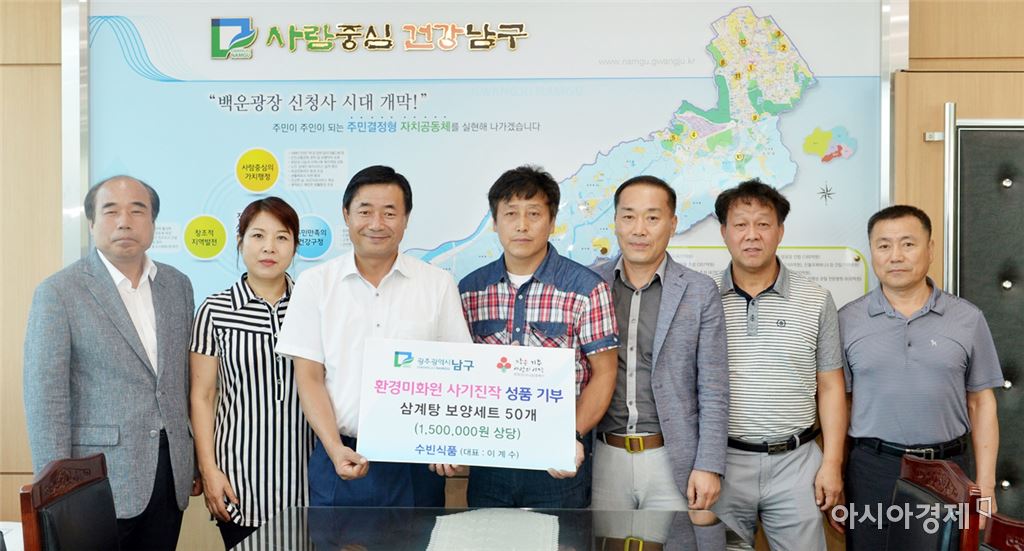 [아시아경제 노해섭 기자]수빈식품 이계수 대표는 11일 남구청을 방문, 환경미화원 사기진작을 위한 삼계탕 보양세트 50개(150만 원 상당)를 최영호 남구청장에게 전달했다.사진제공=광주시 남구<ⓒ세계를 보는 창 경제를 보는 눈, 아시아경제(www.asiae.co.kr) 무단전재 배포금지>