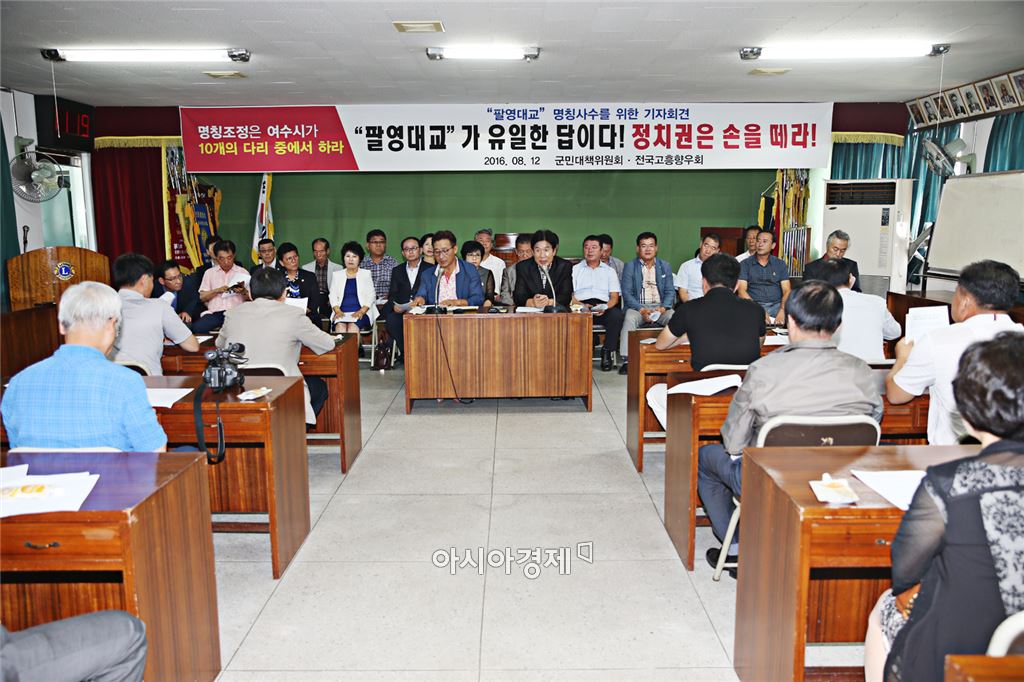 고흥향우회 기자회견 "향우회원 동원해 낙선운동 하겠다" 성명[아시아경제 최경필] 지난 6월 부결된 전남 고흥군 영남면-여수시 적금도 구간 연륙교 명칭 ‘팔영대교’안 사수에 나선 고흥지역 사회단체들과 전국 고흥향우회 회장단이 12일 기자회견을 갖고 “이번 사안에 대해 정치권은 더 이상 나서지 말라”고 주문했다. 이들은 “고흥군과 여수시 주민들의 화합이 우선이지만, 만일 또다시 정치권인사들이 나서서 방해한다면 다음 선거에서 여수, 순천, 광양 등 전남동부지역 20여만명의 향우들을 동원해 대대적인 낙선운동에 나설 것”이라고 경고했다.12일 오전 고흥라이온스회관에서 기자회견을 가진 팔영대교 명칭 사수를 위한 군민대책위원회(위원장 신태균)와 전국고흥향우회(대표 류동신 재경향우회 수석부회장) 등 대표단 18명(이하 고흥대표단)은 공동으로 성명서를 발표했다.이들 고흥대표단은 성명에서 “고흥군의 형제와 다를 바 없는 여수시가, 엑스포 등 여러차례 고흥군민의 지원과 응원을 받았고, 8만의 고흥출신 향우가 살고 있는 데 이렇게 무시할 수 있는가?”라며 “여수시의 한심한 작태를 지켜보면서 이제 우리 고흥군민은 분연히 떨쳐 일어서겠다”고 결의를 다졌다.이어 “오늘의 여수로 성장하기까지 고흥의 역할이 막대하고 결정적이었다는 엄연한 사실을 똑똑히 기억하기 바란다”면서 “‘팔영대교’를 두고 조정이나 협의를 주장하는 정치권은 손을 떼라”고 주장했다.또 “‘팔영대교’는 조정이나 타협의 대상이 아니며, ‘팔영·적금대교’라면 수용하겠다는 여수시의 주장은 자신들이 양보하고 고흥군은 양보하지 않는 것처럼 비칠 수 있는 것으로 고흥군민을 우롱하는 언론플레이에 불과하다”면서 “77만 내외 고흥군민들은 ‘팔영대교’ 명칭이 관철될 때까지 상경투쟁 등 모든 수단을 동원해 우리의 분노와 의지를 관철시킬 것임을 천명한다”고 밝혔다.한편, 군민대책위원회와 전국고흥향우회에서는 연륙교 명칭 재심의 일정이 구체화될 경우 관련기관을 재차 방문해 ‘팔영대교’의 당위성과 군민의 뜻을 강력히 전달할 계획이다.그동안 군민대책위는 4만403명의 군민 서명부와 탄원서를 국무총리실과 국토지리정보원, 국토교통부와 국민권익위원회, 전남도 등 5개 기관을 방문해 전달했다.최경필 기자 <ⓒ세계를 보는 창 경제를 보는 눈, 아시아경제(www.asiae.co.kr) 무단전재 배포금지>