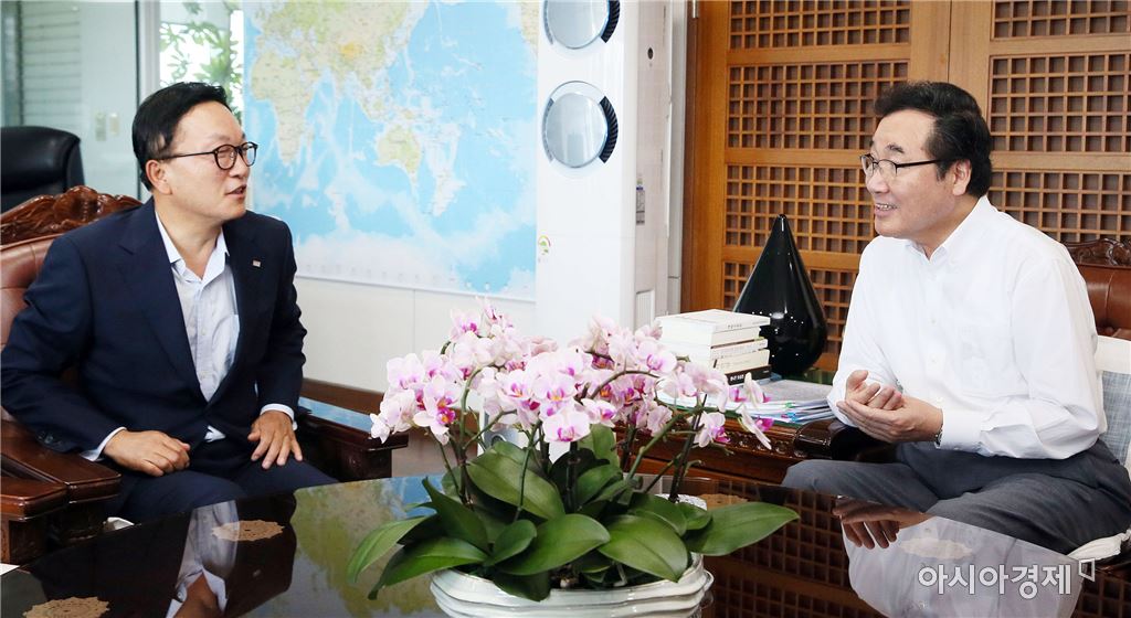 [아시아경제 노해섭 기자]이낙연 전남지사(오른쪽)는 12일 오전 도청 집무실에서 박현주 미래에셋 회장을 면담했다. 경도를 아시아 최고 복합리조트로 만들겠다는 통 큰 투자에 고마움을 표시하고, 투자계획과 지원방안을 논의했다.사진제공=전남도<ⓒ세계를 보는 창 경제를 보는 눈, 아시아경제(www.asiae.co.kr) 무단전재 배포금지>