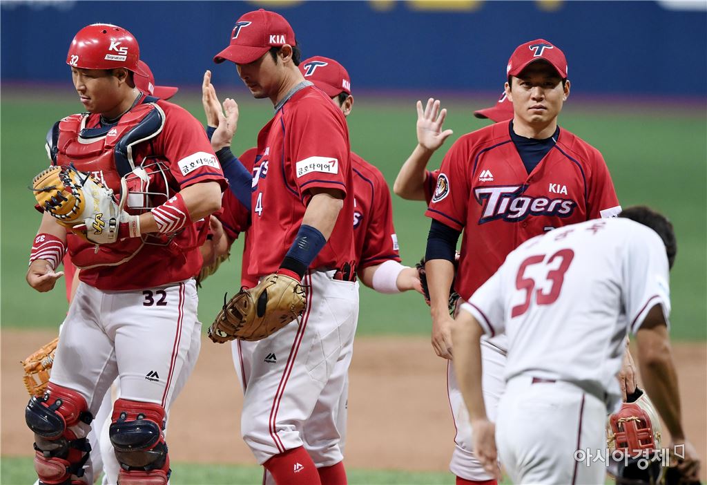 [아시아경제 김현민 기자]프로야구 KIA 타이거즈와 넥센 히어로즈의 2016 KBO리그 경기가 12일 서울 고척스카이돔에서 열렸다. KIA 선수들이 8-2 승리를 확정한 뒤 기쁨을 나누고 있다.김현민 기자 kimhyun81@asiae.co.kr<ⓒ세계를 보는 창 경제를 보는 눈, 아시아경제(www.asiae.co.kr) 무단전재 배포금지>
