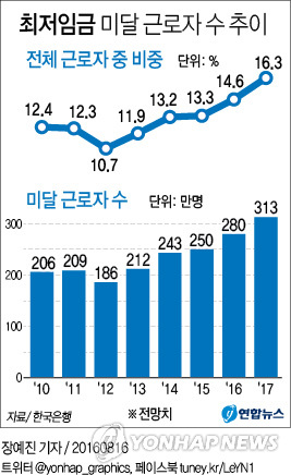 [아시아경제 강성민 인턴기자] 최저임금 인상률에 대한 논란이 일고 있는 가운데 내년에 최저임금을 받지 못하는 근로자 수가 300만 명을 넘어설 것이라는 전망이 나왔다.16일 한국은행은 금융통화위원회에 제출한 보고서를 통해 내년에 최저임금을 받지 못하는 근로자 수가 313만 명에 이를 것이라고 밝혔다. 이는 올해 280만 명보다 약 30만 명이나 늘어난 수치다.전체 근로자 중 최저임금을 받지 못하는 근로자 비중은 2010년 12.4%에서 올해 14.6%로 높아졌다. 내년에는 16.3%로 확대될 것으로 예상되고 있다.최저임금 수준 이상의 임금을 지급하도록 법으로 강제하고 있는데도 왜 최저임금을 받지 못하는 근로자가 이렇게나 많은 것일까.한국은행은 최저임금을 지급하지 않는 업체에 대한 처벌이 제대로 이루어지지 못해 이 같은 결과가 나오는 것으로 보고 있다. 특히, 최저임금법에 대한 예외 조항이 광범위한데다 경영주의 경영 애로 등을 감안하는 경우 처벌이 쉽지 않다.실제로 최저임금 적발 건수는 매년 줄고 있는 상황이다. 2013년 6081건이던 적발 사례가 지난해에는 1502건으로 급락했다.이와 관련, 전문가들은 최저임금 준수율을 높이기 위해서는 근로감독을 철저히 하고 업종별 최저임금 차등화를 도입하는 등 실효성을 높여야한다고 지적했다.강성민 인턴기자 yapal1@asiae.co.kr<ⓒ세계를 보는 창 경제를 보는 눈, 아시아경제(www.asiae.co.kr) 무단전재 배포금지>