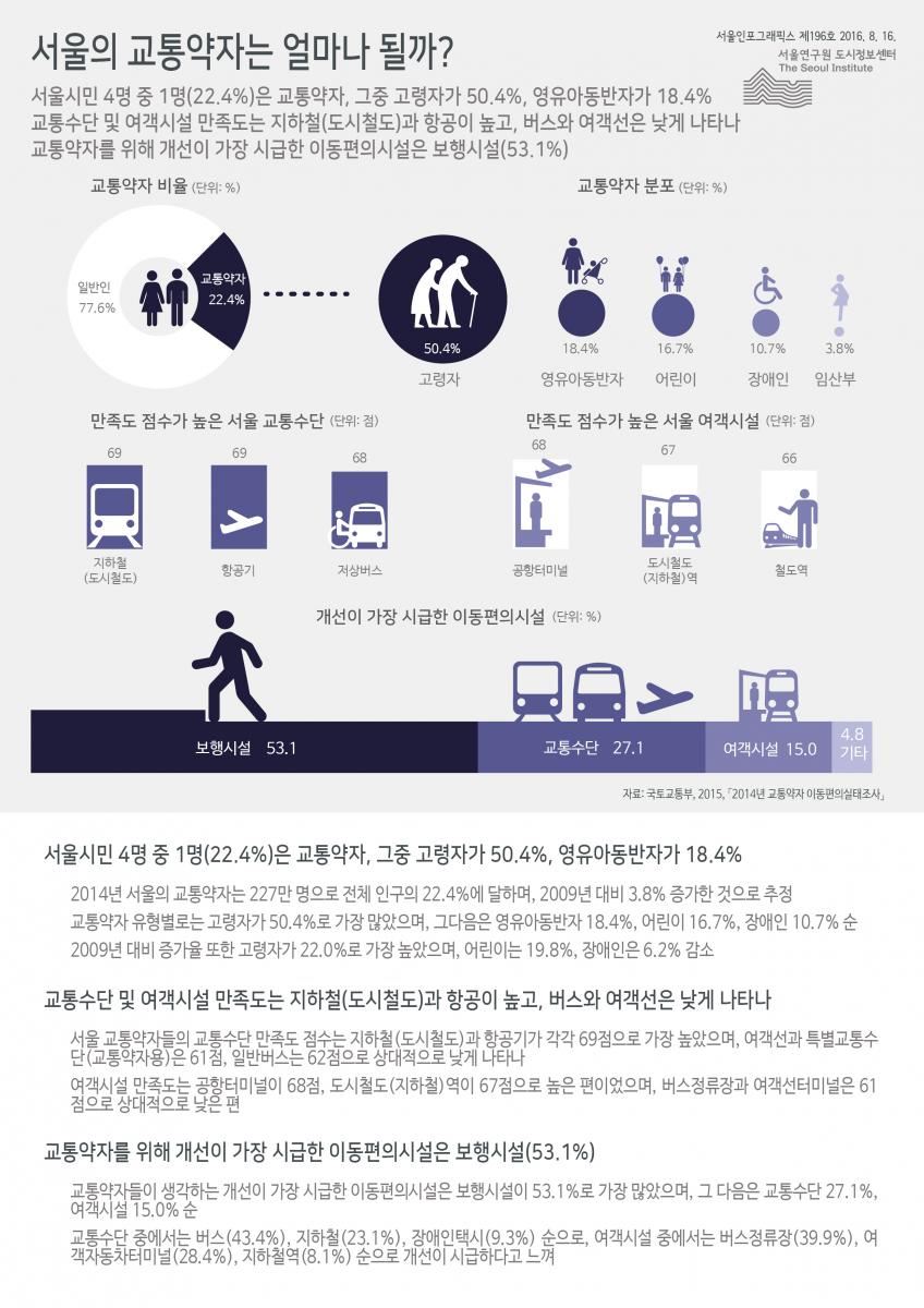 [아시아경제 이현주 기자] 서울시민 4명 중 1명은 교통약자인 것으로 나타났다. 교통약자는 고령자(50.4%)가 가장 많았고 그 다음이 영유아동반자(18.4%), 어린이(16.7%), 장애인(10.6%), 임산부(3.8%) 순이었다.16일 시가 발표한 서울인포그래픽스 제196에 따르면 서울의 교통약자는 227만명으로 전체 인구의 22.4%에 달한다. 2009년에 비해 3.8% 증가한 것으로 추정된다.교통약자들의 교통수단 만족도 점수는 지하철(도시철도)과 항공기가 각각 69점으로 가장 높았으며, 여객선과 특별교통수단(교통약자용)은 61점, 일반버스는 62점으로 상대적으로 낮게 나타났다.