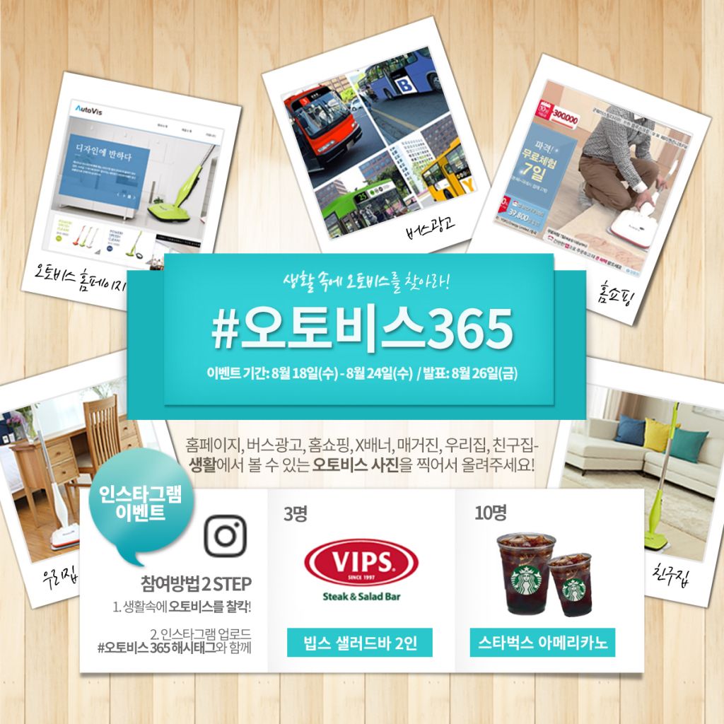 [아시아경제 조강욱 기자] 오토비스는 자동물걸레청소기를 증정하는 '오토비스365' 이벤트를 진행한다고 17일 밝혔다.'오토비스365' 이벤트는 오토비스의 제품은 항상 우리 주변에 있으며, 365일 필요한 자동물걸레청소기라는 의미를 전달하고자 마련된 행사로 오는 24일까지 인스타그램을 통해 진행된다. 이번 이벤트는 인스타그램 사용자라면 누구나 참여가 가능하다. 일상생활에서 오토비스의 제품이나 광고(버스광고, 홈쇼핑, 잡지 등) 발견 시 사진을 촬영하고, 해시태그(#오토비스365)와 함께 개인 계정에 업로드하면 자동 응모된다. 이벤트 참여자 중 총 3명에게 오토비스 무선자동물걸레청소기(KAC-5500)를 증정한다. 최태웅 오토비스 대표는 "오토비스의 자동물걸레청소기를 주변에서 찾아보는 소소한 재미를 선사해 드리고자 이번 이벤트를 준비했다"며 "앞으로도 소비자들의 관심과 사랑에 보답할 수 있는 다양한 이벤트를 진행할 것"이라고 말했다. 한편, 오토비스의 자동물걸레청소기(KAC-5500)는 장소이동에 제약이 없는 무선형 제품으로, 1분에 2000회 이상의 앞뒤슬라이드 구동방식을 통해 적은 힘으로도 손걸레질의 10배 이상의 효과를 낼 수 있어 예비 신혼부부들뿐 아니라 주부들에게도 인기가 높은 제품이다. 조강욱 기자 jomarok@asiae.co.kr<ⓒ세계를 보는 창 경제를 보는 눈, 아시아경제(www.asiae.co.kr) 무단전재 배포금지>조강욱 기자 jomarok@asiae.co.kr<ⓒ아시아 대표 석간 '아시아경제' (www.newsva.co.kr) 무단전재 배포금지>