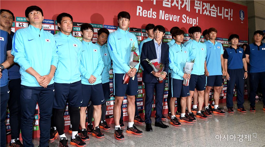 [인천공항=아시아경제 김현민 기자]2016 리우올림픽 축구대표팀이 17일 인천국제공항을 통해 귀국했다. 선수단이 포즈를 취하고 있다.신태용 감독이 이끄는 올림픽 축구대표팀은 조별리그에서 2승1무 조 1위로 8강에 진출했지만 8강전에서 온두라스에 0-1로 져 4강 진출에 실패했다. 김현민 기자 kimhyun81@asiae.co.kr<ⓒ세계를 보는 창 경제를 보는 눈, 아시아경제(www.asiae.co.kr) 무단전재 배포금지>